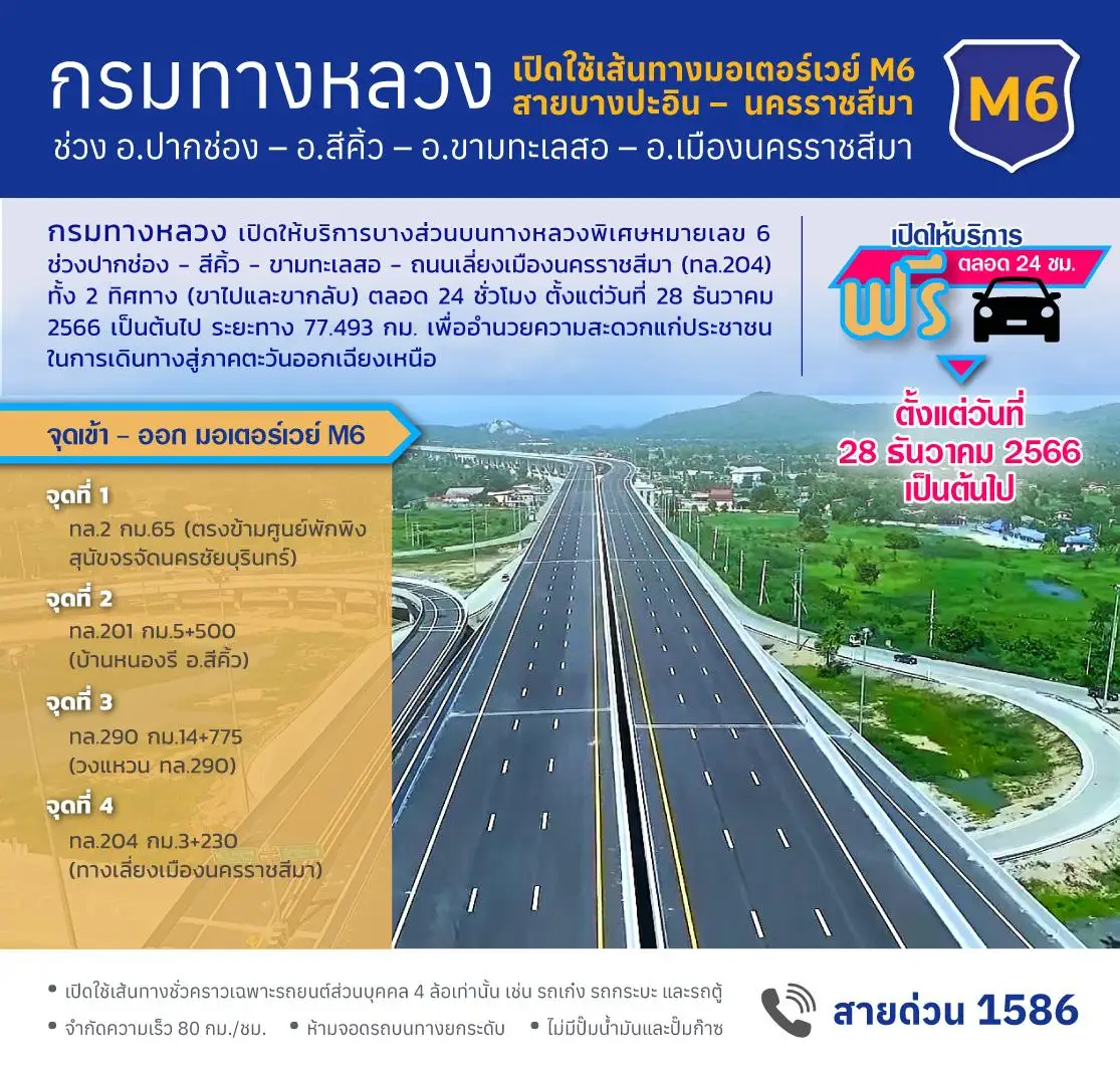 โดยเปิดใช้ทางหลวงพิเศษหมายเลข 6 (M6) หรือมอเตอร์เวย์สายบางประอิน-นครราชสีมา ทิศทางขาขึ้นและขาล่อง รวมระยะทาง 77.493 กิโลเมตร ซึ่งเป็นถนนที่จะรองรับการจราจรและอำนวยความสะดวก ความปลอดภัยในการเดินทางสู่ภาคตะวันออกเฉียงเหนือ ซึ่งจะให้บริการฟรีจนกว่าการก่อสร้างโครงการจะเสร็จสมบูรณ์และกำหนดเก็บค่าผ่านทางในปี 2568