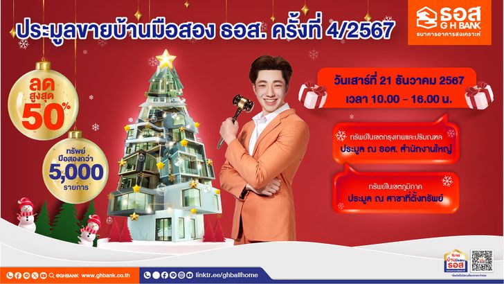 นายวิทยา แสนภักดี รองกรรมการผู้จัดการ กลุ่มงานปรับโครงสร้างหนี้ และรักษาการผู้ช่วยกรรมการผู้จัดการ สายงานบังคับคดี ธนาคารอาคารสงเคราะห์ (ธอส.) เปิดเผยว่า ธอส. สนับสนุนให้คนไทยมีบ้านเป็นของตนเองส่งท้ายปี 2567 ด้วยการจัดงานประมูลขายบ้านมือสอง ธอส. ประจำปี ครั้งที่ 4/2567 ในวันเสาร์ที่ 21 ธ.ค. 67 พร้อมกันทั่วประเทศ ระหว่างเวลา 10.00 – 16.00 น. โดยคัดบ้านมือสอง คุณภาพดี ทำเลเด่นทั่วประเทศ จำนวนมากกว่า 8,000 รายการ ทั้งประเภทบ้านเดี่ยว ทาวน์เฮาส์ ห้องชุด (คอนโดมิเนียม) อาคารพาณิชย์ และที่ดินเปล่า มาเปิดประมูลในราคาพิเศษ ด้วยส่วนลดสูงสุดถึง 50% จากราคาประเมิน แบ่งเป็นทรัพย์ในกรุงเทพมหานคร และปริมณฑล จำนวน 1,200 รายการ ราคาเริ่มต้นประมูลต่ำสุดเพียง 85,000 บาท ได้แก่