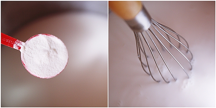 แช่น้ำให้พองแล้วช้อนขึ้นมาให้สะเด็ดน้ำ นำเจลาตินที่ช้อนขึ้นมาใส่ในหม้อ ใช้ตะกร้อคนให้ละลาย แล้วน้ำไปตั้งไฟอ่อนๆ