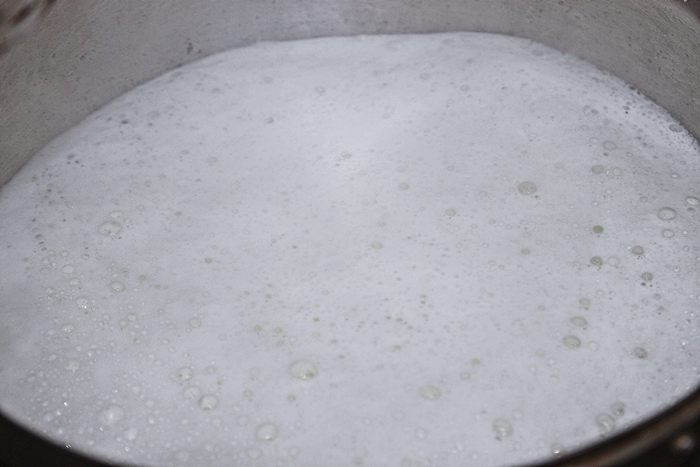 นำหม้อไปตั้งไฟแรงพอเดือดก็ค่อยลดไฟกลางเคี่ยวต่อไปเรื่อยๆ เพื่อให้ผงวุ้นละลาย