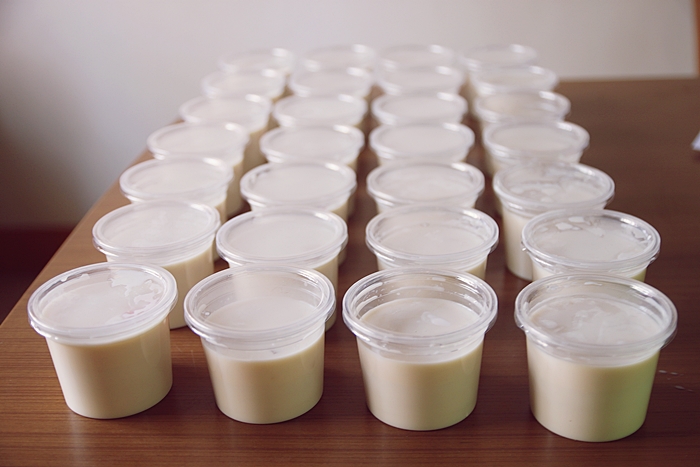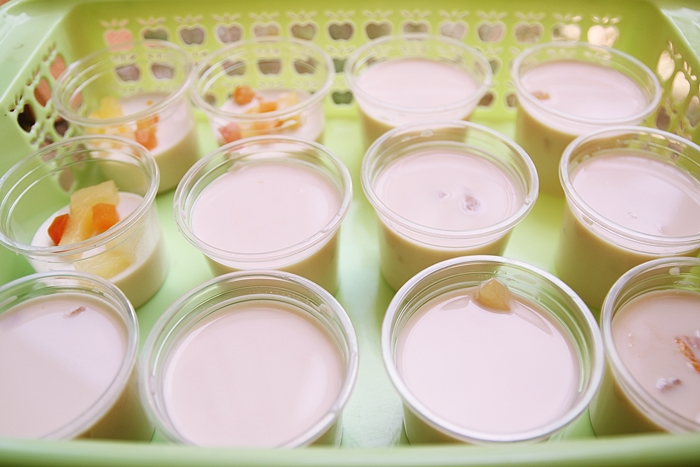 จากนั้นเราก็ตักเต้าฮวยใส่ถ้วยที่เตรียมไว้ แล้วนำไปแช่ตู้เย็นประมาณ 3-4 ชั่วโมง และเตรียมทำน้ำราดเต้าฮวย