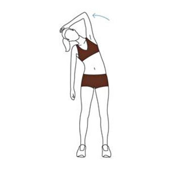 ท่าที่ 5 : เหยียดลำตัวด้านข้าง ให้ยืนตรงแยกขาเท่ากับความกว้างของไหล่ ยกแขนข้างหนึ่งงอข้อศอกจับด้านข้างศีรษะแล้วผลักให้เอนไปอีกด้านจนรู้สึกว่าลำตัวตึง นับ 1-5 แล้วเปลี่ยนมาทำอีกข้าง