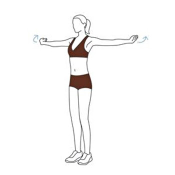 ท่าที่ 2 : กางแขน พลิกมือสองข้างไปมา ให้ยืนตรงหลังตรง กางแขนสองข้างออกเหมือนท่าบิน แล้วให้พลิกข้อมือโบกมือสองข้างมาข้างหน้า-ไปข้างหลัง นับลมหายใจให้ได้ 5 ครั้ง