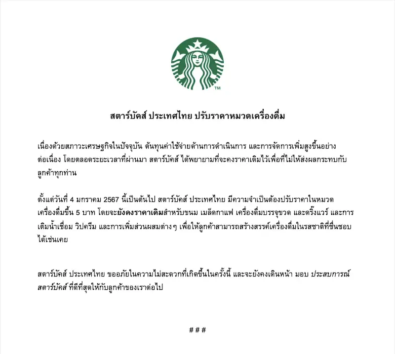 “ทางเราได้พยายามอย่างเต็มที่ที่จะคงราคาจำหน่ายเดิมไว้เพื่อที่ไม่ให้ส่งผลกระทบต่อลูกค้าของเรา แต่ด้วยต้นทุนค่าใช้จ่ายด้านดำเนินการและจัดการได้เพิ่มสูงขึ้นอย่างต่อเนื่อง ทำให้สตาร์บัคส์มีความจำเป็นต้องทำการปรับราคาเครื่องดื่มทุกประเภทขึ้นตั้งแต่วันที่ 4 ม.ค.67 ในร้านสตาร์บัคส์ทุกสาขาในประเทศไทยค่ะ”