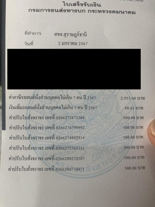 ปรากฏว่านอกจากต้องเสียค่าภาษีแล้ว ยังต้องจ่ายค่าปรับใบสั่งจราจรอีกด้วย โดยค่าปรับใบสั่งจราจรทั้งหมด 6 ใบ ใบละ 500 บาท รวมเป็นเงิน 3,000 บาท