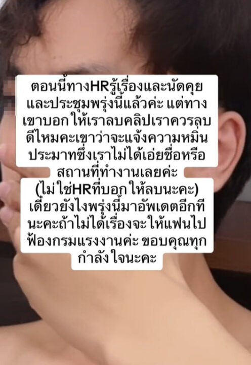 อย่างไรก็ตาม แฟนสาวยังอัปเดตเพิ่มเติมว่า “ตอนนี้ทาง HR รู้เรื่องและนัดคุยและประชุมพรุ่งนี้แล้วค่ะ แต่ทางเขาบอกให้เราลบคลิป เราควรลบดีมั้ยคะ เขาว่าจะเเจ้งความหมิ่นประมาท ซึ่งเราไม่ได้เอ่ยชื่อหรือสถานที่ทำงานเลยค่ะ (ไม่ใช่ HR ที่บอกให้ลบนะคะ) เดี๋ยวยังไงพรุ่งนี้มาอัปเดตอีกทีนะคะ ถ้าไม่ได้เรื่องจะให้แฟนไปฟ้องกรมแรงงานค่ะ ขอบคุณทุกกำลังใจนะคะ”….