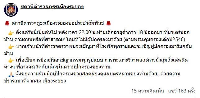 เพื่อเป็นการป้องกันอาชญากรรมทุกรูปแบบ การทะเลาะวิวาทและการมั่วสุมสิ่งเสพติดต่างๆ ที่อาจจะเกิดกับเด็กๆในความปกครองของท่าน จึงขอความร่วมมือผู้ปกครองช่วยสอดส่องดูแลบุตรหลานของท่านด้วย…ด้วยความปรารถนาที่จากสภ.เมืองระยอง”