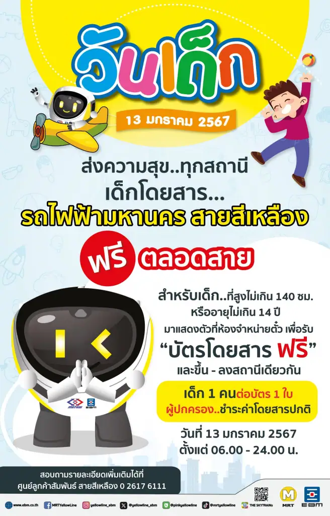 การรถไฟฟ้าขนส่งมวลชนแห่งประเทศไทย (รฟม.) ร่วมกับ บริษัท ทางด่วนและรถไฟฟ้ากรุงเทพ จำกัด (มหาชน) (BEM) บริษัท อีสเทิร์น บางกอกโมโนเรล จำกัด (EBM) และบริษัท นอร์ทเทิร์น บางกอกโมโนเรล จำกัด (NBM) เตรียมส่งมอบความสุข พร้อมเสริมสร้างประสบการณ์ในการใช้ระบบขนส่งสาธารณะทางรางให้แก่เด็กๆ เนื่องในวันเด็กแห่งชาติ ประจำปี 2567 ด้วยการโดยสารรถไฟฟ้ามหานคร ฟรี! ครบทั้ง 4 สาย ในวันเสาร์ที่ 13 มกราคม 2567 ตลอดระยะเวลาให้บริการ รายละเอียดดังนี้