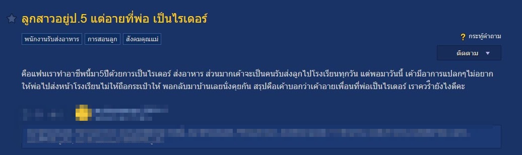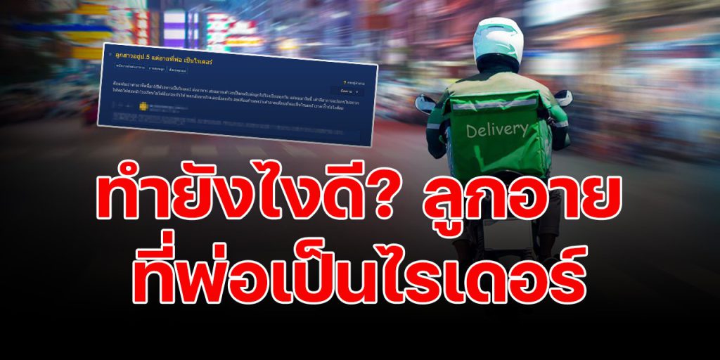 “ลูกสาวอยู่ ป.5 แต่อายที่พ่อเป็นไรเดอร์ คือแฟนเราทำอาชีพนี้มา 5 ปี ด้วยการเป็นไรเดอร์ส่งอาหาร ส่วนมากเขาจะเป็นคนรับส่งลูกไปโรงเรียนทุกวัน แต่พอมาวันนี้เขามีอาการแปลกๆ ไม่อยากให้พ่อไปส่งหน้าโรงเรียน ไม่ให้ถือกระเป๋าให้ พอกลับมาบ้านเลยนั่งคุยกัน สรุปคือเขาบอกว่า เขาอายเพื่อนที่พ่อเป็นไรเดอร์ เราควรทำยังไงดีคะ”