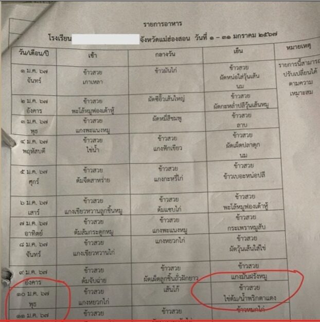 พระปลัด กล่าวว่า มีครูส่งเอกสารการสั่งซื้ออาหารมาให้ พบว่ายอดการสั่งซื้อผิดปกติ อยากแรกคือซื้อแพงกว่าท้องตลอดทั่วไป พร้อมกับให้เอกสารรายการอาหารของโรงเรียน วันที่ 1-30 มกราคม ซึ่งจากการตรวจสอบพบว่า วันที่ 10 มกราคมนั้น มีมื้ออาหาร ดังนี้ มื้อเช้า “ข้าวสวยแกงหยวกไก่” มื้อกลางวัน “เส้นโก้” แล้ว มื้อเย็น “ข้าวสวย ไข่ต้ม/น้ำพริกตาแดง” ซึ่งทำให้เด็กกินข่าวไม่อิ่ม