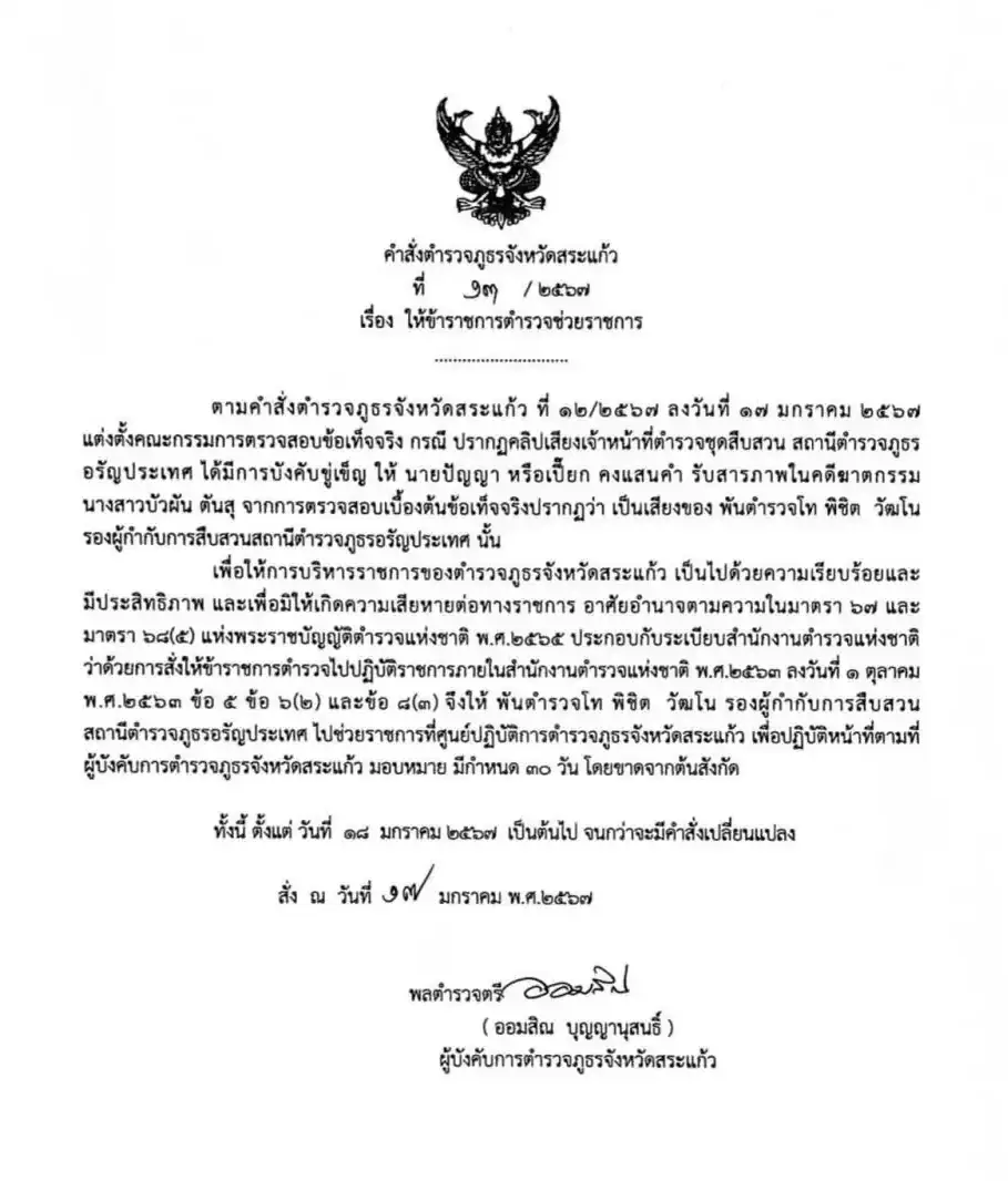จากการตรวจสอบเบื้องต้นข้อเท็จจริงปรากฏว่า เป็นเสียงของ พันตำรวจโท พิชิต วัฒโน รองผู้กำกับการสืบสวนสถานีตำรวจภูธรอรัญประเทศนั้น เพื่อให้การบริหารราชการของตำรวจภูธรจังหวัดสระแก้ว เป็นไปด้วยความเรียบร้อยและมีประสิทธิภาพ และเพื่อมิให้เกิดความเสียหายต่อทางราชการ อาศัยอำนาจตามความในมาตรา 67 และมาตรา 68(5) แห่งพระราชบัญญัติตำรวจแห่งชาติ พ.ศ.2565 ประกอบกับระเบียบสำนักงานตำรวจแห่งชาติว่าด้วยการสั่งให้ข้าราชการตำรวจไปปฏิบัติราชการภายในสำนักงานตำรวจแห่งชาติ พ.ศ.2563 ข้อ 5 ข้อ 6(2) และข้อ 8(3)