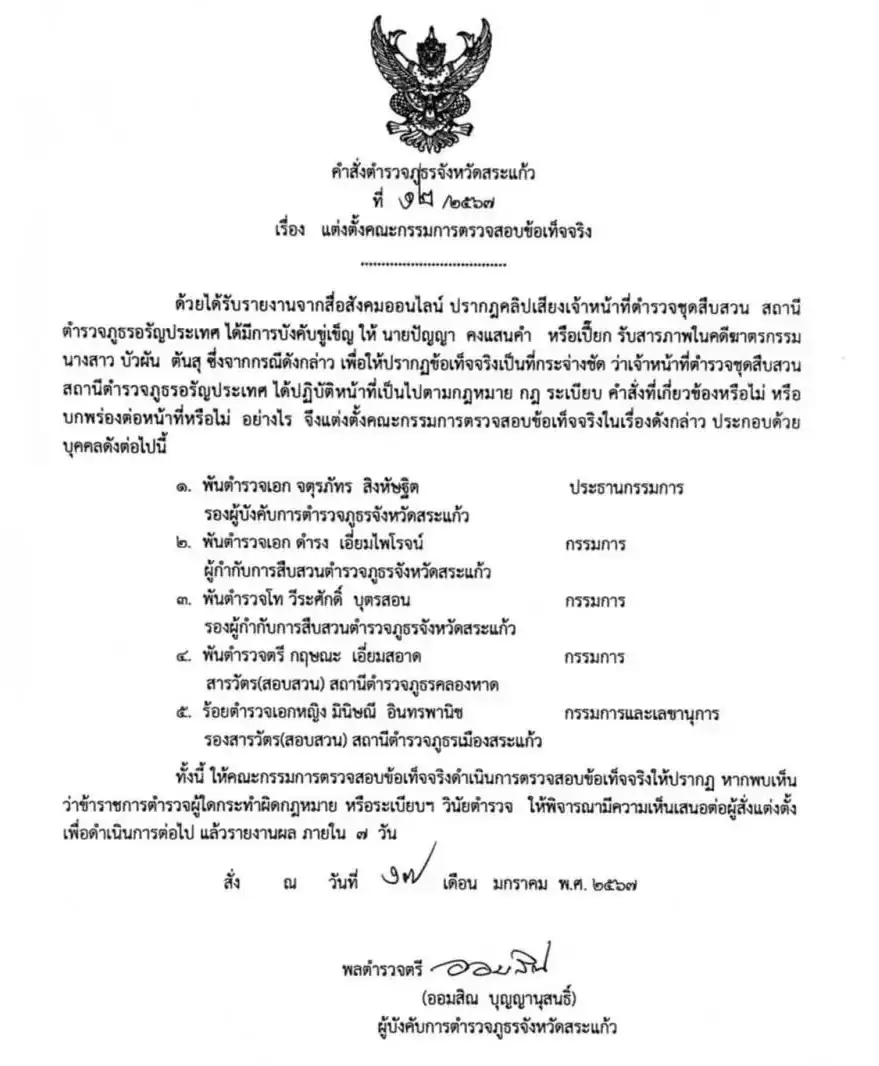 ล่าสุด พลตำรวจตรี ออมสิณ บุญญานุสนธิ์ ผู้บังคับการตำรวจภูธรจังหวัดสระแก้ว ได้ลงนามในคำสั่งตำรวจภูธรจังหวัดสระแก้ว ที่ 25 /2567 เรื่อง แต่งตั้งคณะกรรมการตรวจสอบข้อเท็จจริง