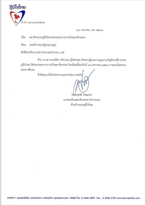 19 ม.ค.2567 นายศุภชัย ใจสมุทร นายทะเบียนสมาชิกพรรคภูมิใจไทย เปิดเผยว่า น.ส.ชนม์ทิดา อัศวเหม ผู้สมัครสส.บัญชีรายชื่อ พรรคภูมิใจไทย ในลำดับที่ 5 ได้ส่งหนังสือขอลาออกจากการเป็นสมาชิกพรรคภูมิใจไทย ต่อนายทะเบียนสมาชิกพรรคภูมิใจไทย