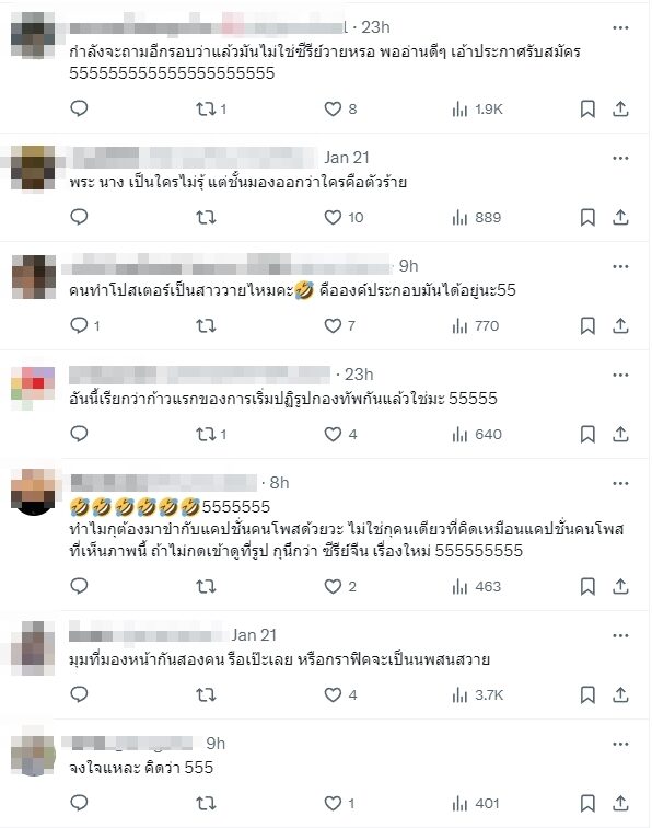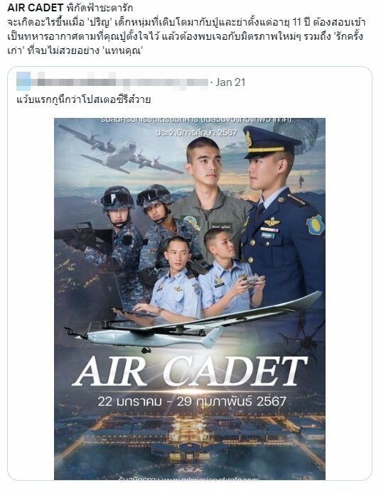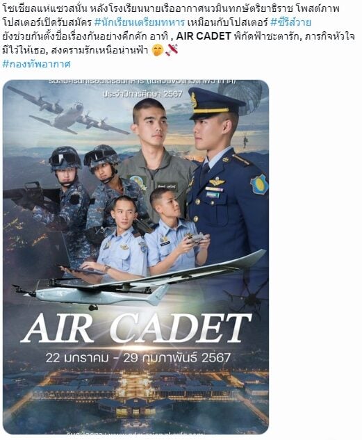 แต่ที่กลายเป็นจุดที่ทำให้หลายคนแชร์ออกไปจำนวนมาก ก็ดูจะเป็นโปรดักชั่น การถ่ายทำโปสเตอร์ ที่ดูจับวางนักเรียนนายร้อยเป็นคู่ๆ และมีแอคชั่นที่ดูคล้ายกับซีรีส์วาย พร้อมกับการเขียนแคปชั่นตรงกลางว่า AIR CADET ที่ดูเหมือนกับเป็นซีรีส์ จนหลายคนนำไปคิดพล็อตเรื่องกันต่อแบบรัวๆ