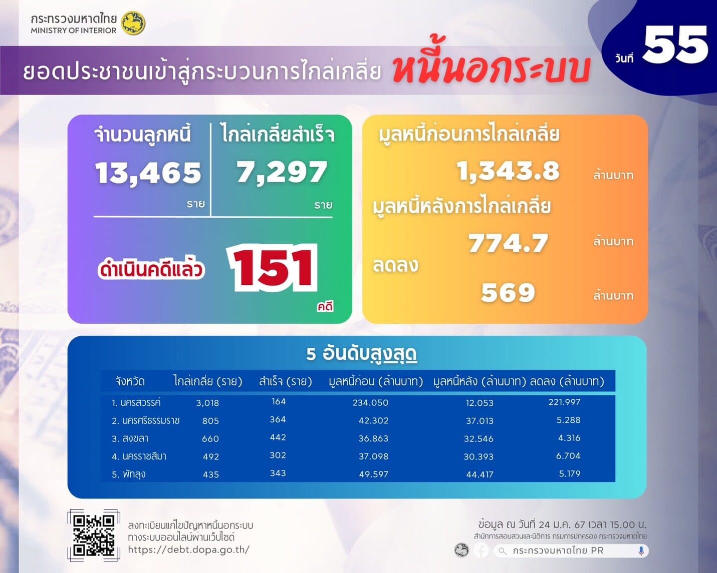 24 มกราคม นายสุทธิพงษ์ จุลเจริญ ปลัดกระทรวงมหาดไทย เปิดเผยถึงการลงทะเบียนแก้ไขปัญหาหนี้นอกระบบ เป็นวันที่ 55 นับตั้งแต่เปิดลงทะเบียนเมื่อวันที่ 1 ธันวาคม 2566 เป็นต้นมา โดยจากข้อมูลของสำนักการสอบสวนและนิติการ กรมการปกครอง เมื่อเวลา 15.00 น. มีมูลหนี้รวม 8,966.132 ล้านบาท ประชาชนลงทะเบียนแล้ว 134,164 ราย เป็นการลงทะเบียนผ่านระบบออนไลน์ 114,067 ราย และการลงทะเบียน ณ ศูนย์อำนวยการแก้ไขหนี้นอกระบบ 20,097 ราย รวมจำนวนเจ้าหนี้ 100,376 ราย มีพื้นที่/จังหวัดที่มีผู้ลงทะเบียนมากที่สุด 5 ลำดับแรก 1.กรุงเทพมหานคร ยังคงมากที่สุด มีผู้ลงทะเบียน 11,054 ราย เจ้าหนี้ 7,186 ราย มูลหนี้ 795.601 ล้านบาท 2.จังหวัดนครศรีธรรมราช มีผู้ลงทะเบียน 5,466 ราย เจ้าหนี้ 4,874 ราย มูลหนี้ 365.292 ล้านบาท 3.จังหวัดสงขลา มีผู้ลงทะเบียน 4,959 ราย เจ้าหนี้ 3,809 ราย มูลหนี้ 326.288 ล้านบาท 4.จังหวัดนครราชสีมา มีผู้ลงทะเบียน 4,928 ราย เจ้าหนี้ 3,433 ราย มูลหนี้ 382.992 ล้านบาท 5.จังหวัดขอนแก่น มีผู้ลงทะเบียน 3,510 ราย เจ้าหนี้ 2,887 ราย มูลหนี้ 297.606 ล้านบาท ขณะที่จังหวัดที่มีผู้ลงทะเบียนน้อยที่สุด 5 ลำดับแรก ได้แก่ 1.จังหวัดแม่ฮ่องสอน มีผู้ลงทะเบียน 213 ราย เจ้าหนี้ 222 ราย มูลหนี้ 12.044 ล้านบาท 2.จังหวัดระนอง มีผู้ลงทะเบียน 293 ราย เจ้าหนี้ 206 ราย มูลหนี้ 19.638 ล้านบาท 3.จังหวัดสมุทรสงคราม มีผู้ลงทะเบียน 351 ราย เจ้าหนี้ 272 ราย มูลหนี้ 11.386 ล้านบาท 4.จังหวัดตราด มีผู้ลงทะเบียน 431 ราย เจ้าหนี้ 329 ราย มูลหนี้ 18.315 ล้านบาท และ 5.จังหวัดสิงห์บุรี มีผู้ลงทะเบียน 460 ราย เจ้าหนี้ 330 ราย มูลหนี้ 23.075 ล้านบาท