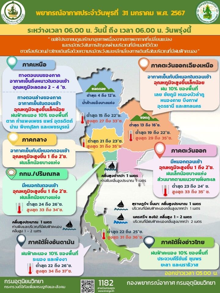 31 มกราคม กรมอุตุนิยมวิทยา พยากรณ์อากาศ 24 ชั่วโมงข้างหน้า ลมฝ่ายตะวันตกในระดับบนพัดปกคลุมภาคเหนือตอนบน ลักษณะเช่นนี้ทำให้บริเวณดังกล่าวมีอากาศหนาวเย็นลงและอุณหภูมิจะลดลง สำหรับบริเวณความกดอากาศสูง หรือมวลอากาศเย็นกำลังปานกลางที่ปกคลุมประเทศไทยและทะเลจีนใต้อ่อนกำลังลง ลักษณะเช่นนี้ทำให้ประเทศไทยตอนบนมีอุณหภูมิสูงขึ้น แต่ยังคงมีอากาศเย็นกับมีหมอกในตอนเช้า