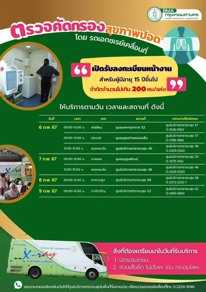 สำนักอนามัย กรุงเทพมหานคร ชวนคนกรุงมีสุขภาพดี เข้ารับบริการตรวจคัดกรองสุขภาพปอด โดยรถเอกซเรย์เคลื่อนที่เปิดรับลงทะเบียนหน้างาน สำหรับผู้ที่มีอายุ 15 ปีขึ้นไป จำกัดจำนวนไม่เกิน 200 คน/แห่ง เพียงยื่นบัตรประจำตัวประชาชน