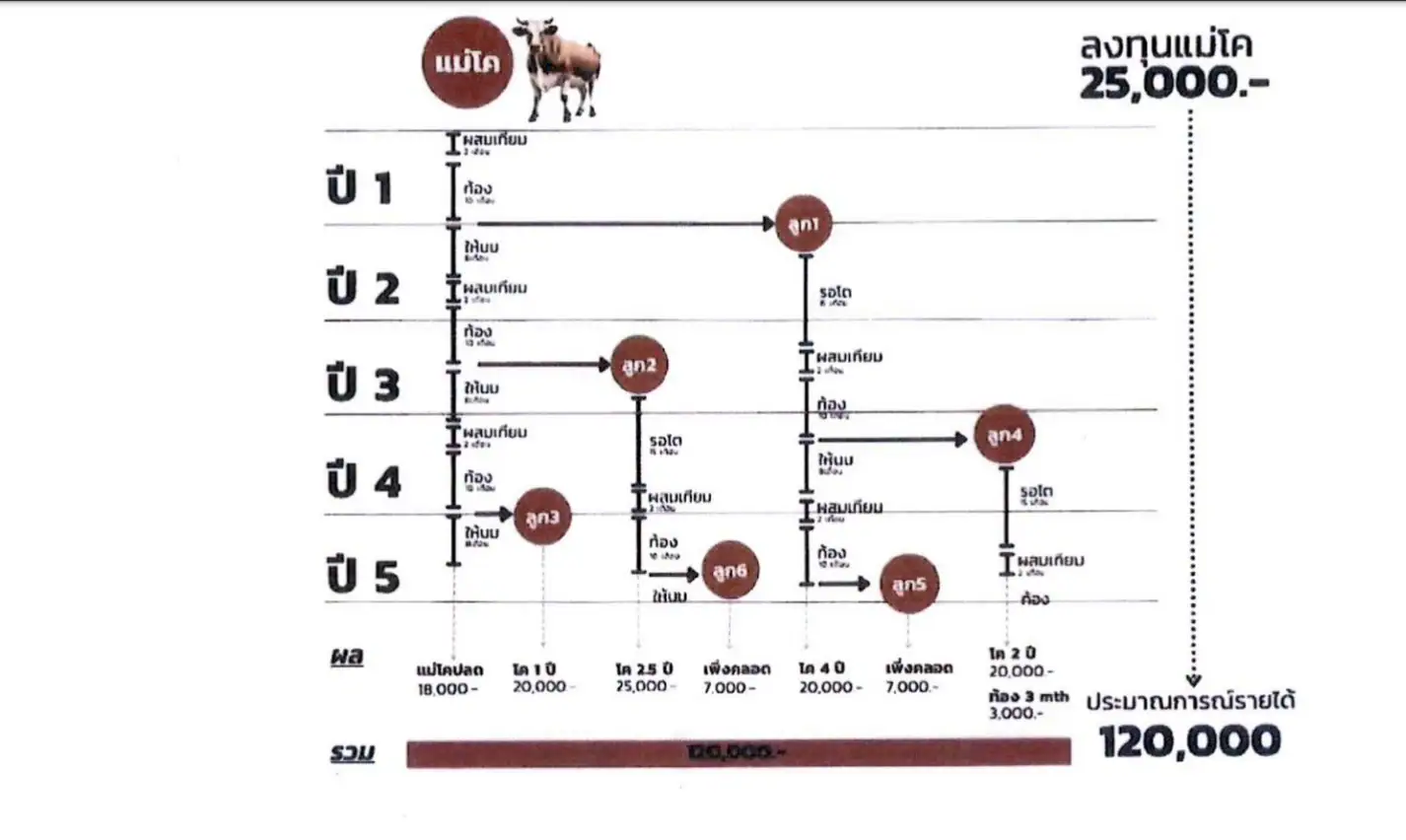 - สร้างรายได้ต่อครัวเรือนอย่างน้อย 240,000 บาท/ครัวเรือน จากต้นทุน 50,000 บาท หรือ 4.8 เท่า ในระยะเวลา 5 ปี (โค 2 ตัว เฉลี่ยราคาโคตัวละ 25,000 บาท สร้างรายได้ไม่น้อยกว่า 120,000 บาทต่อตัว)