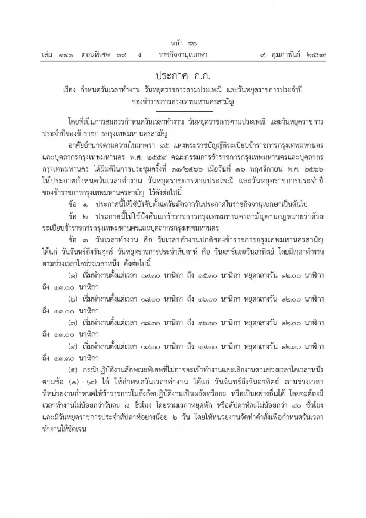 โดยที่เป็นการสมควรกำหนดวันเวลาทำงาน วันหยุดราชการตามประเพณี และวันหยุดราชการประจำปีของข้าราชการกรุงเทพมหานครสามัญอาศัยอำนาจตามความในมาตรา 45 แห่งพระราชบัญญัติระเบียบข้าราชการกรุงเทพมหานครและบุคลากรกรุงเทพมหานคร พ.ศ. 2554 คณะกรรมการข้าราชการกรุงเทพมหานครและบุคลากร กทม. ได้มีมติในการประชุมครั้งที่ 11/2566 เมื่อวันที่ 16 พ.ย. 2566 ให้ประกาศกำหนดวันเวลาทำงาน วันหยุดราชการตามประเพณี และวันหยุดราชการประจำปีของข้าราชการกรุงเทพมหานครสามัญ ไว้ดังต่อไปนี้