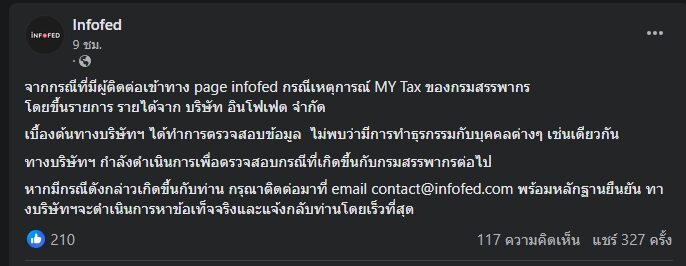 ขณะที่ บริษัท อินโฟเฟด ซึ่งถูกระบุถึงในช่องดังกล่าว ได้โพสต์ชี้แจงลงในเฟซบุ๊ก “Infofed” ระบุว่า จากกรณีที่มีผู้ติดต่อเข้าทาง page infofed กรณีเหตุการณ์ MY Tax ของกรมสรรพากร โดยขึ้นรายการ รายได้จาก บริษัท อินโฟเฟด จำกัด