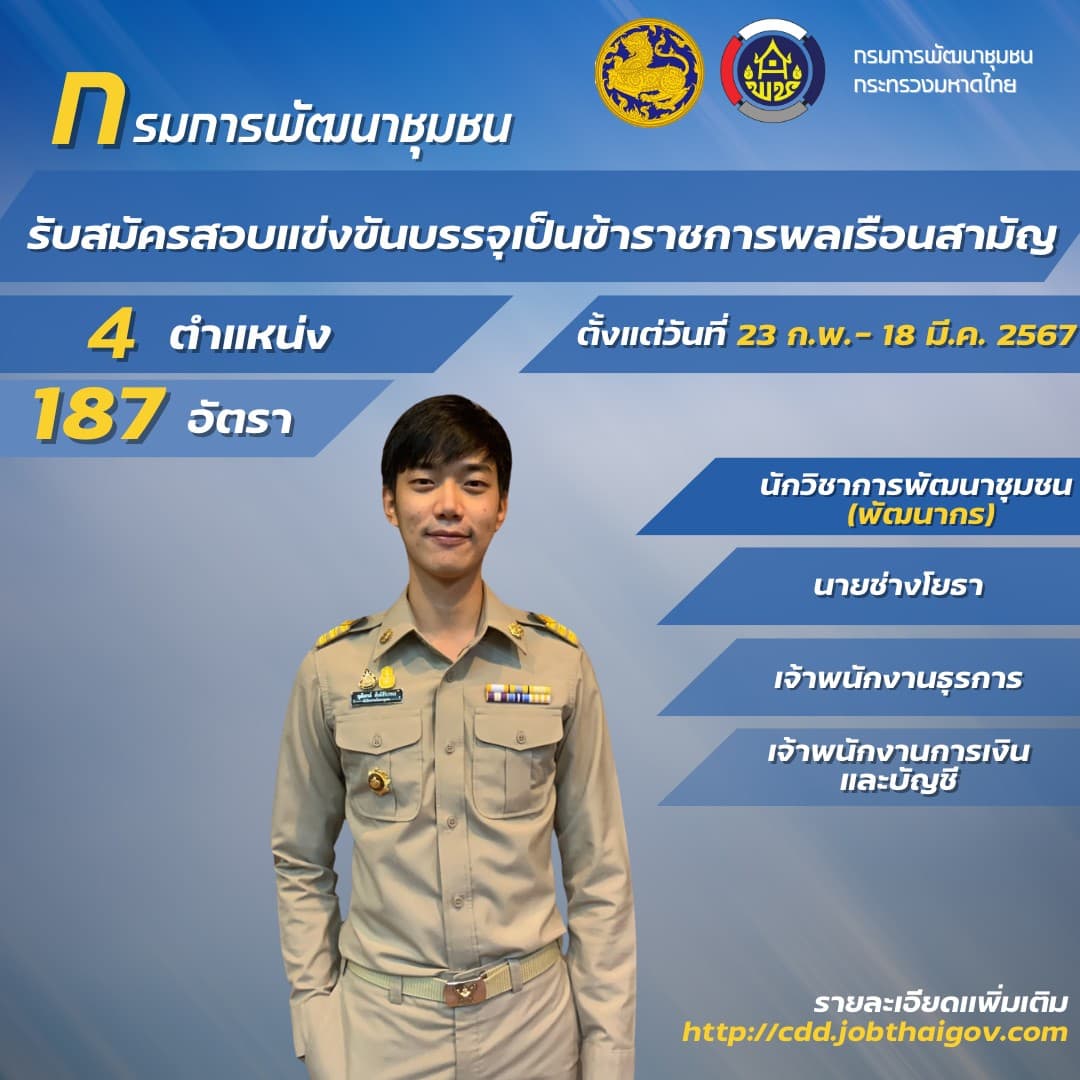 ประกาศกรมการพัฒนาชุมชน รับสมัครสอบแข่งขันเพื่อบรรจุและแต่งตั้งบุคคลเข้ารับราชการเป็นข้าราชการพลเรือนสามัญ ในตำแหน่งนักวิชาการพัฒนาชุมชนปฏิบัติการ (พัฒนากร) ตำแหน่งนายช่างโยธาปฏิบัติงานตำแหน่งเจ้าพนักงานธุรการปฏิบัติงาน และตำแหน่งเจ้าพนักงานการเงินและบัญชีปฏิบัติงานสังกัดกรมการพัฒนาชุมชน