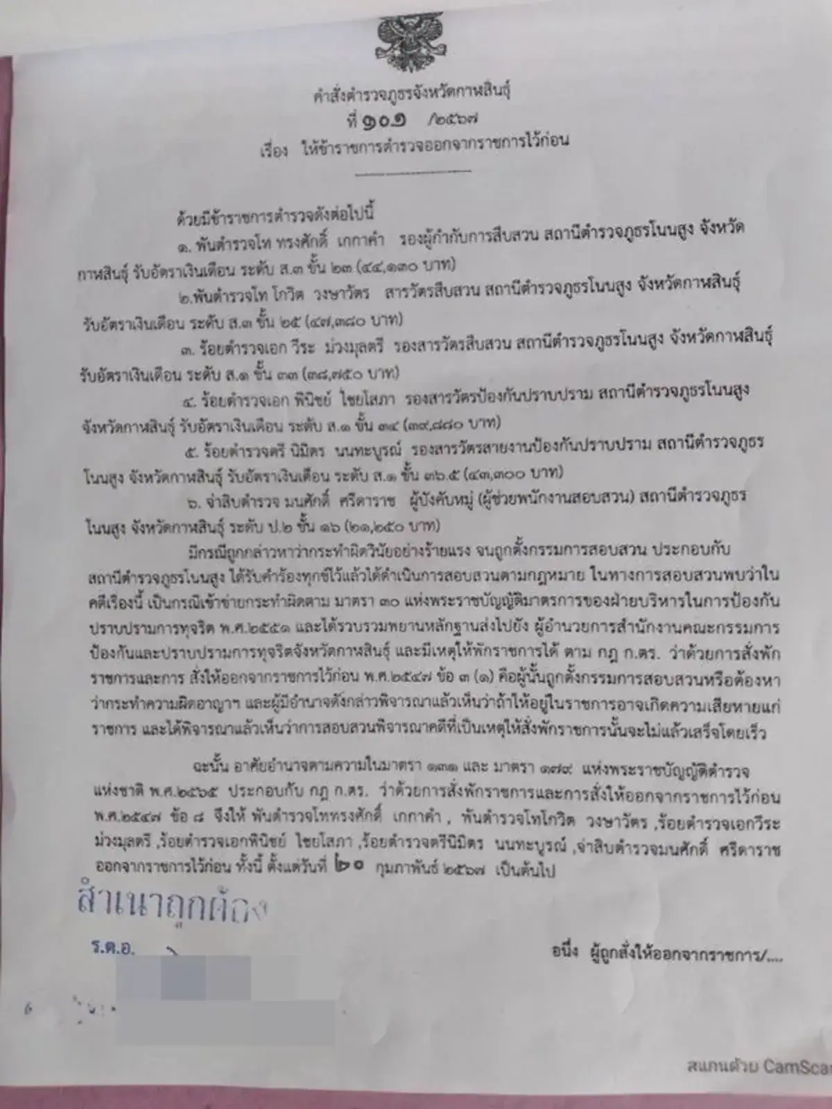 วันที่ 23 ก.พ. 67 มีคำสั่งตำรวจภูธรจังหวัดกาฬสินธุ์ ที่ 101/2567 เรื่อง ให้ข้าราชการตำรวจออกจากราชการไว้ก่อน ด้วยมีข้าราชการตำรวจดังต่อไปนี้