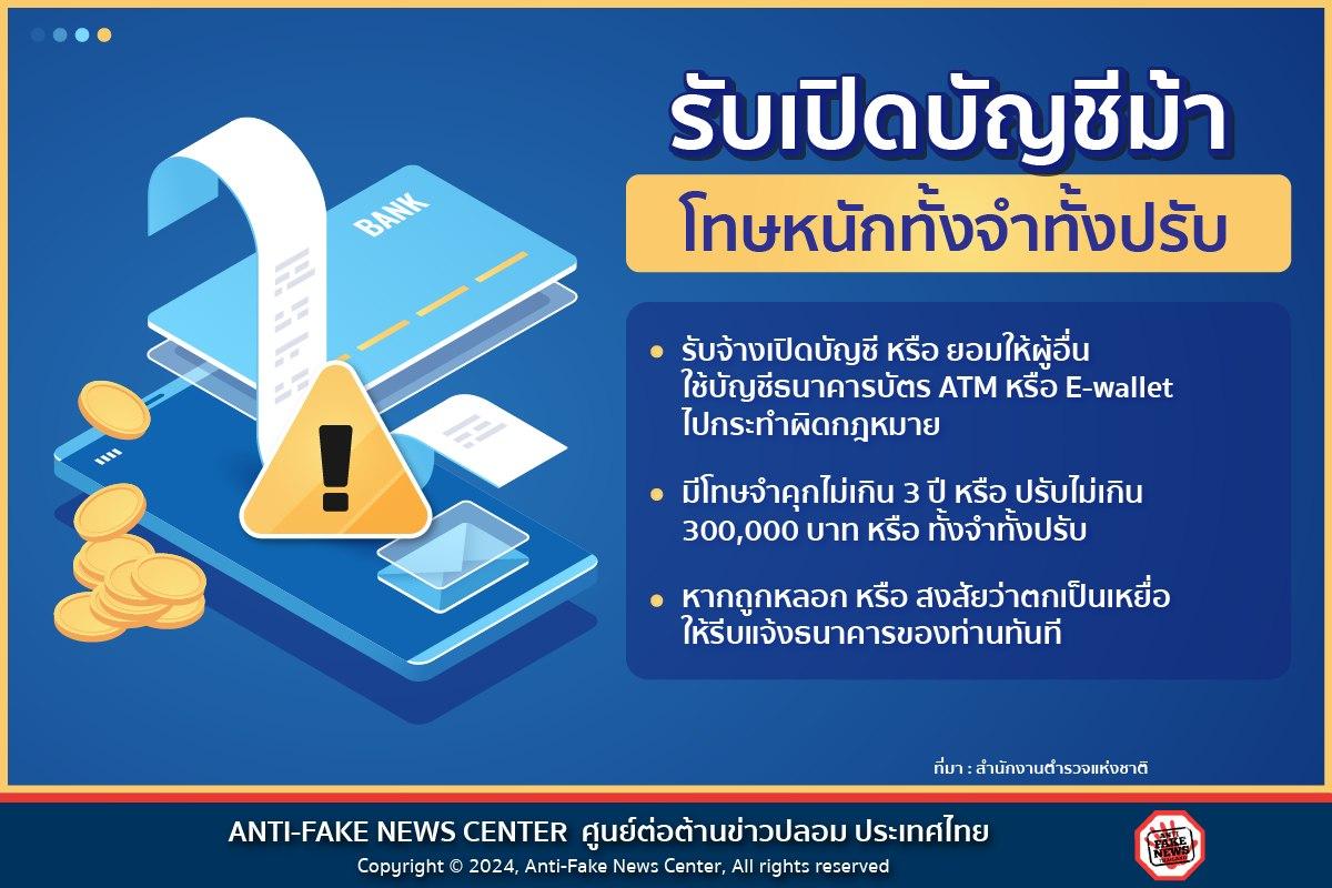จากกรณีมีประชาชนหลายราย เจออุบายของแก๊งมิจฉาชีพหลอกเพื่อให้ไปเปิดบัญชีม้า ไม่ว่าจะตั้งใจหรือไม่ตั้งใจ ได้รับเงินค่าจ้างหรือไม่ได้รับเงินก็ตาม ถือว่าเป็นความผิดทางกฎหมายทั้งสิ้น โดยสำนักงานตำรวจแห่งชาติ เตือนว่า การรับจ้างเปิดบัญชีหรือยอมให้ผู้อื่นใช้บัญชีธนาคาร มีโทษหนักทั้งจำทั้งปรับ โดยในปัจจุบันแก๊งมิจฉาชีพมีวิธีการมากมายเพื่อหลอกล่อเหยื่อให้เปิดบัญชีม้า ก่อนนำไปใช้ในการกระทำผิดกฎหมาย และผู้ที่ตกเป็นเหยื่ออาจไม่รู้ว่าการกระทำนี้เป็นสิ่งที่ผิดกฎหมาย