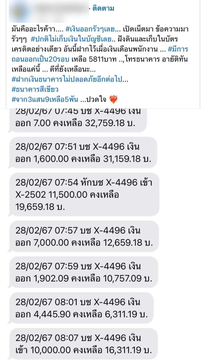 โดยระบุข้อความว่า “มันคืออะไรค้าา…. #เงินออกรัวๆเลย… เปิดเน็ตมา ข้อความมารัวๆๆ #ปกติไม่เก็บเงินในบัญชีเลย.. ฝังดินและเก็บในบัตรเครดิตอย่างเดียว อันนี้ฝากไว้เผื่อเงินเดือนพนักงาน … #มีการถอนออกเป็น20รอบ เหลือ 5811บาท ..,โทรธนาคาร อายัติทันเหลือแค่นี้ … ดีที่ยังเหลือนะ…ฝากเงินธนาคารไม่ปลอดภัยอีกต่อไป…#ธนาคารสีเขียว #จาก3แสน9 เหลือ5พัน …ปวดใจ”