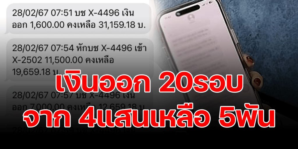 สาวรายหนึ่งโพสต์เฟซบุ๊ก เป็นภาพข้อความแจ้งเตือนในมือถือจากธนาคารแห่งหนึ่ง แสดงสถานะเงินถูกถอนออกจากบัญชี เป็น 20 ครั้ง โดยแต่ละครั้งยอดไม่เท่ากัน บางยอด 7 บาท บางยอด 1,600 บาท บางยอดหลักหมื่น จากเงินกว่า 3 แสน เหลือเงินเพียง 5 พันบาท โชคดีที่โทรอายัติธนาคารทัน