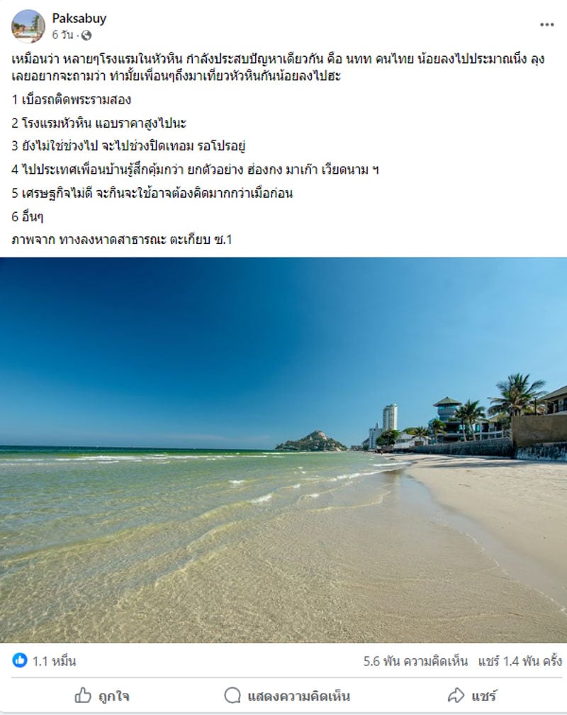 27 ก.พ.67 จากโพสต์ของเพจเฟซบุ๊ก Paksabuy โพสต์ถามว่า “ทำไมคนเที่ยวหัวหินน้อยลง?” โดยชาวเน็ตได้พร้อมใจกันตอบ ซึ่งเหตุผลตรงกันคือ “เบื่อรถติดถนนเส้นพระราม 2” ที่ก่อสร้างยาวนานเหลือเกิน บางคนบอกว่า บ้านอยู่ จ.สมุทรสงคราม เดินทางยังเบื่อเลย เบื่อไม่พอต้องมาระแวงอะไรหล่นใส่รถอีก และทำถนนเส้นนี้ตั้งแต่ยังเด็ก จนตอนนี้ทำงานแล้ว ยังไม่เสร็จเลย เป็นต้น