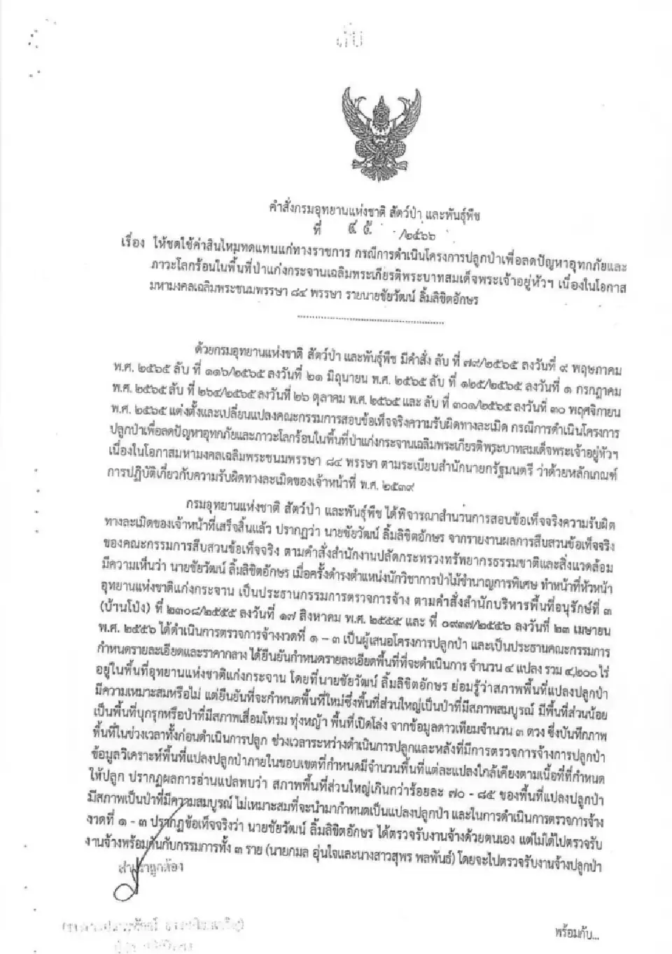แต่ในขณะเดียวกันแหล่งข่าวกระทรวงทรัพยากรธรรมชาติและสิ่งแวดล้อม(ทส.) เปิดเผยว่า ภายในกระทรวงฯ ได้มีการส่งต่อเอกสารคำสั่งกรมอุทยาน 45/2566 เรื่อง ให้ชดใช้ค่าสินไหมทดแทนแก่ทางราชการ กรณีการดำเนินโครงการปลูกป่าเพื่อลดปัญหาอุทกภัยและ ภาวะโลกร้อนในพื้นที่ป่าแก่งกระจานเฉลิมพระเกียรติพระบาทสมเด็จพระเจ้าอยู่หัวฯ เนื่องในโอกาสมหามงคลเฉลิมพระชนมพรรษา 84 พรรษา รายนายชัยวัฒน์ ลิ้มลิขิตอักษร ลงวันที่ 15 มีนาคม 2566