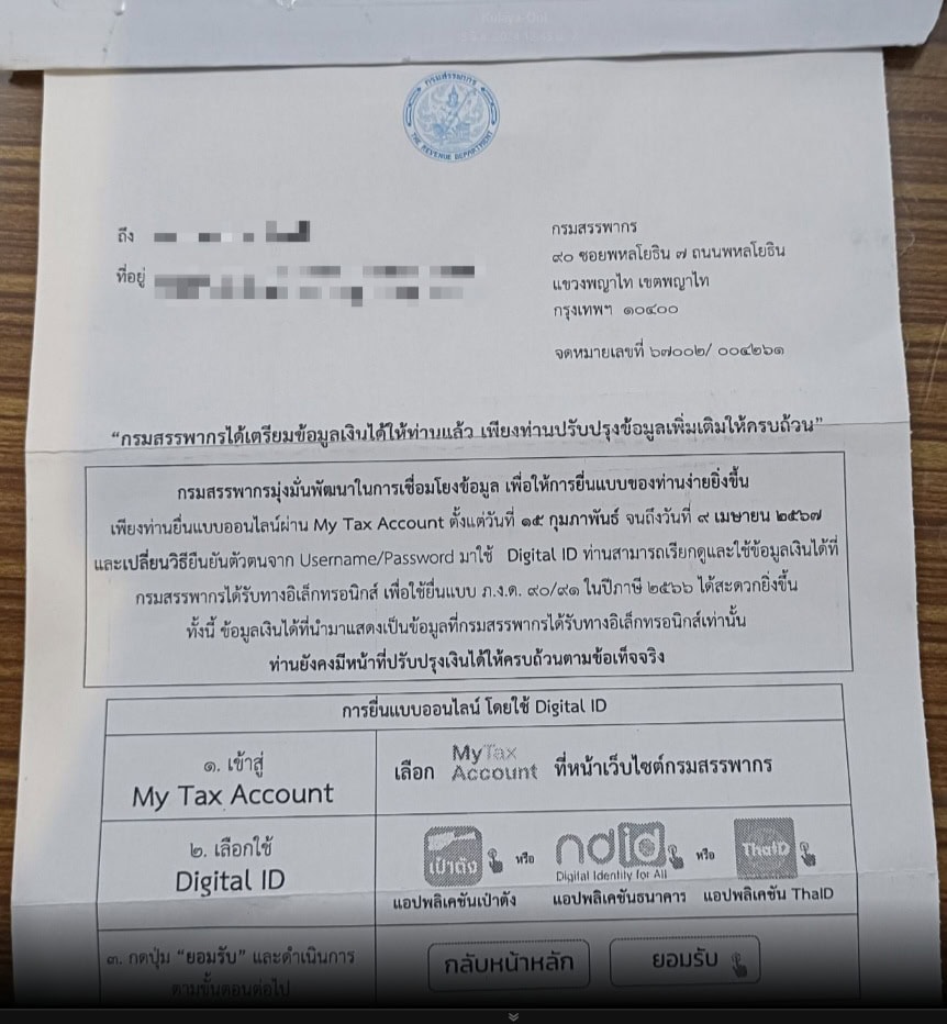 ทั้งนี้ จดหมายดังกล่าว เป็นการแจ้งเรื่องที่กรมสรรพากรให้บริการตรวจสอบข้อมูลเงินได้ สำหรับการยื่นแบบ ภ.ง.ด.90/91 ปีภาษี 2566 ผ่านระบบ My Tax Account สำหรับการยืนยันตัวตนด้วย Digital ID ซึ่งจะเป็นการแจ้งขั้นตอนและวิธีการเข้าใช้ระบบเพื่อตรวจสอบข้อมูล และบริการข้อมูลการยื่นแบบแสดงรายการ (Pre-Fill) เท่านั้น ไม่มีการแนบ URL Link หรือ QR Code ใด ๆ ไปกับจดหมายประชาสัมพันธ์