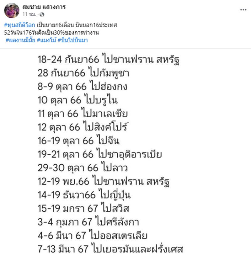 11 มีนาคม 2567 นายสมชาย แสวงการ สมาชิกวุฒิสภา (สว.) โพสต์ข้อความผ่านเฟซบุ๊กว่า “ทุบสถิติโลก เป็นนายกฯ 6 เดือน บินนอก 16 ประเทศ 52 วัน ใน 176 วัน คิดเป็น 30% ของการทำงาน ผลงานมีมั้ย แมงโม้ บินไปบินมา”