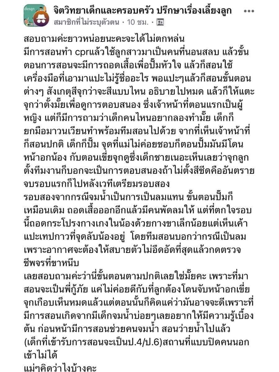 เลยสอบถามค่ะว่านี่ขั้นตอนตามปกติเลยใช่มั้ยคะ เพราะที่มาสอนจะเป็นพี่กู้ภัย แค่ไม่ค่อยดีกับที่ลูกต้องโดนจับหน้าอกเขี่ยจุกเกือบเห็นหมดแล้วแต่ตอนนั้นก็คิดแค่ว่ามันอาจจะดีเพราะที่มีการสอนเกิดจากมีเด็กจมน้ำบ่อยๆ เลยอยากให้มีความรู้เบื้องต้น ก่อนหน้ามีการสอนช่วยคนจมน้ำ สอนว่ายน้ำไปแล้ว