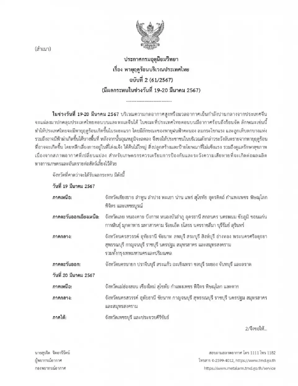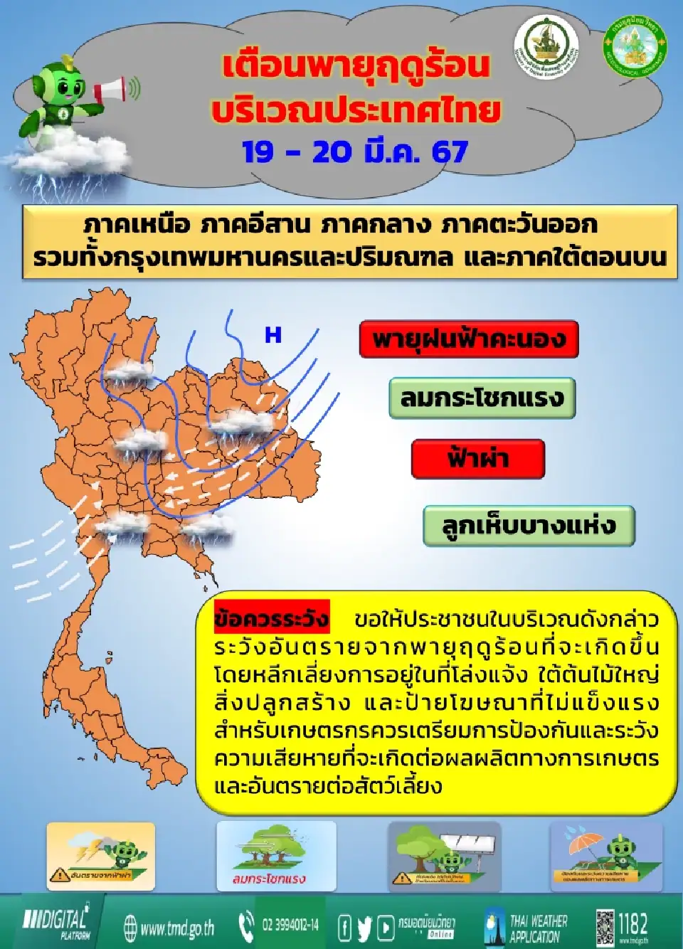 กรมอุตุนิยมวิทยา ออกประกาศเตือนฉบับที่ 2 เรื่อง พายุฤดูร้อนบริเวณประเทศไทย มีผลกระทบในช่วงวันที่ 19-20 มีนาคม 2567 โดยจังหวัดที่คาดว่าจะได้รับผลกระทบ มีดังนี้