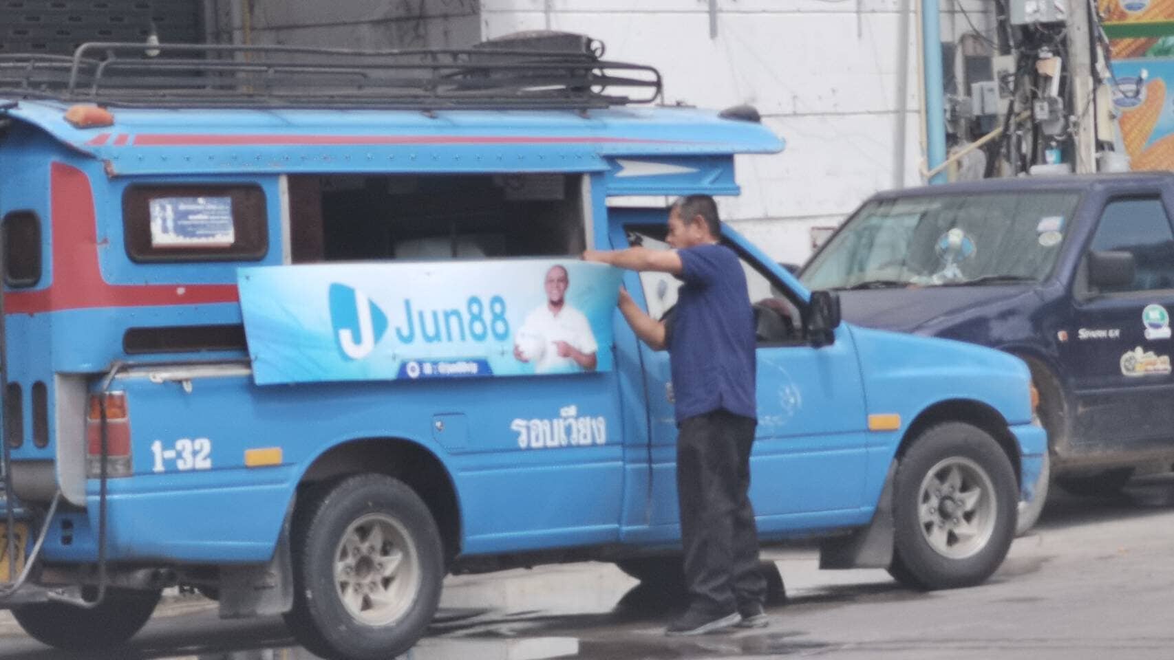 ในการตรวจสอบพบว่ามีรถโดยสารประจำทางทั้งสี่ล้อใหญ่ สี่ล้อเล็กและรถสามล้อเครื่อง จอดเรียงรายเพื่อรอให้บริการลูกค้าจำนวนกว่า 30 คัน ทั้งจุดท่าจอดรถและบริเวณดโดยรอบสถานีขนส่ง ซึ่งพบว่ากว่าครึ่งของรถโดยสารมีการติดป้ายของเว็ปพนันออนไลน์ชื่อ Jun 88 เป็นป้ายไวนิลกว้างประมาณ 30 นิ้ว ยาวประมาณ 1.20 เมตร ติดไว้ด้านข้างตัวรถทั้งสองด้าน บางคันก็มีการติดไว้บริเวณด้านท้ายของรถ