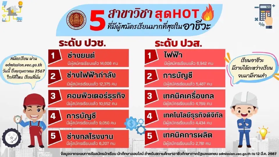 พบว่า สาขาวิชายอดนิยมของนักเรียนระดับประกาศนียบัตรวิชาชีพ (ปวช. 1) อันดับ 1 คือ ช่างยนต์ จำนวนผู้สมัครเรียน 14,008 คน รองลงมาคือ ช่างไฟฟ้ากำลัง คอมพิวเตอร์ธุรกิจ การบัญชี ช่างกลโรงงาน ตามลำดับ