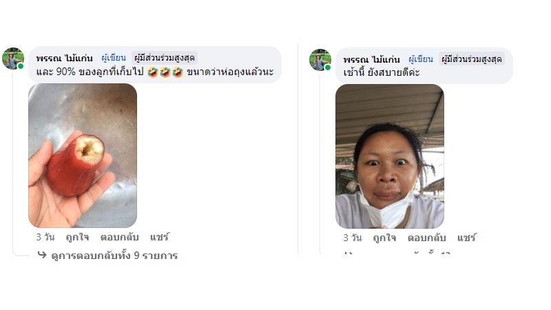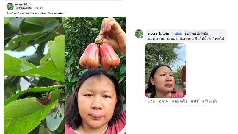 โดยเธอระบุข้อความว่า “ตัวอะไรคะ โดนต่อยค่ะ ไม่แน่นหน้าอก กินยาแก้แพ้แล้ว” ซึ่งความตั้งใจของเธอ คือ การไปเก็บชมพู่มากิน แต่งานนี้คงไม่ง่ายอย่างที่เธอคิด เพราะเจอเจ้าแมลงตัวร้ายกันซีน แม้จะได้กินผลไม้ตามที่หวัง แต่ก็แลกมากับปากที่บวมเป่ง