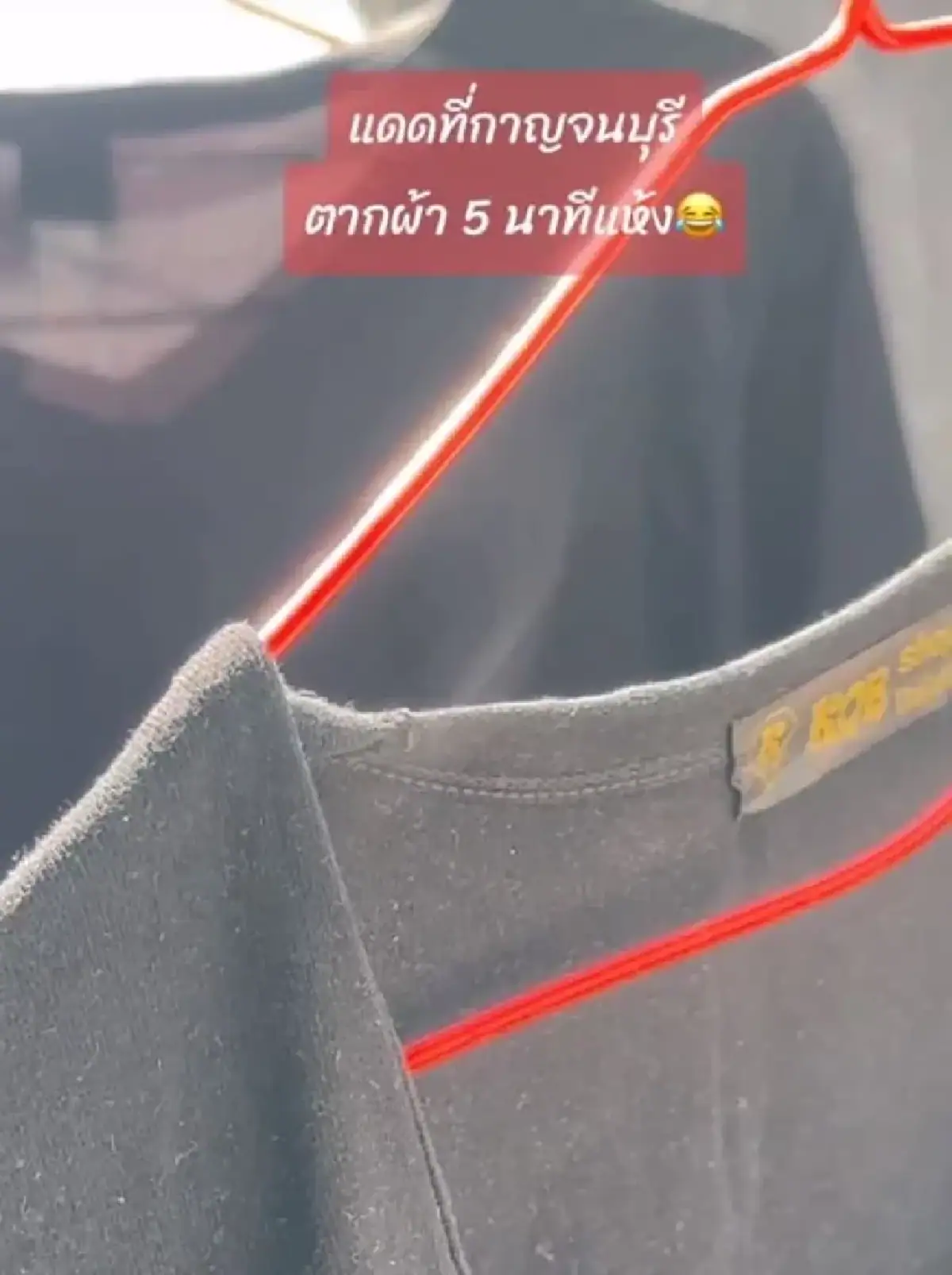 ทางด้านเจ้าของโพสต์ระบุว่า “ตากผ้าเสร็จ ผ้าแห้งพอดี #แดดเมืองกาญมันแรง #กาญจนบุรีร้อนมาก” นอกจากนี้ ในคลิปยังมีแคปชั่นอีกว่า “แดดที่กาญจนบุรี ตากผ้า 5 นาทีแห้ง”