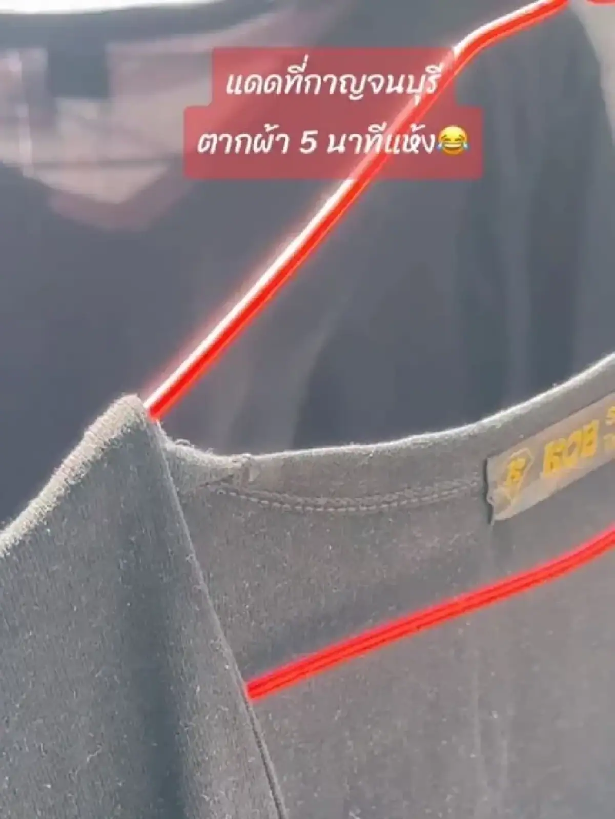 เป็นเรื่องราวที่แชร์อยู่ในโลกโซเชียล โดยผู้ใช้งาน TikTok @kanyaphat.daw โพสต์คลิปรีวิวแดด จ.กาญจนบุรี ร้อนจัดตากผ้า 5 นาทีแห้ง และในคลิปจะเห็นว่ามีไอลอยออกมาจากเสื้อ ซึ่งเธอยืนยันว่าไม่ใช่เอฟเฟกต์ คลิปดังกล่าวยอดวิวกว่า 1.1 ล้านวิว