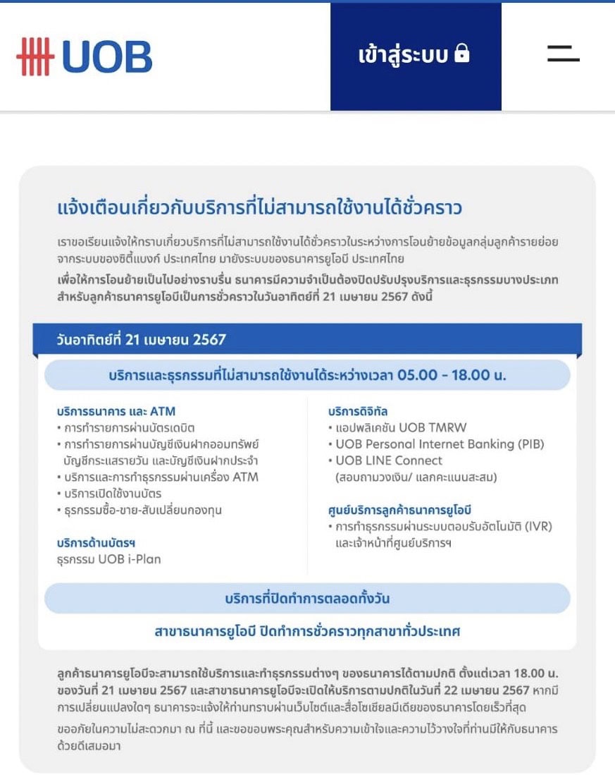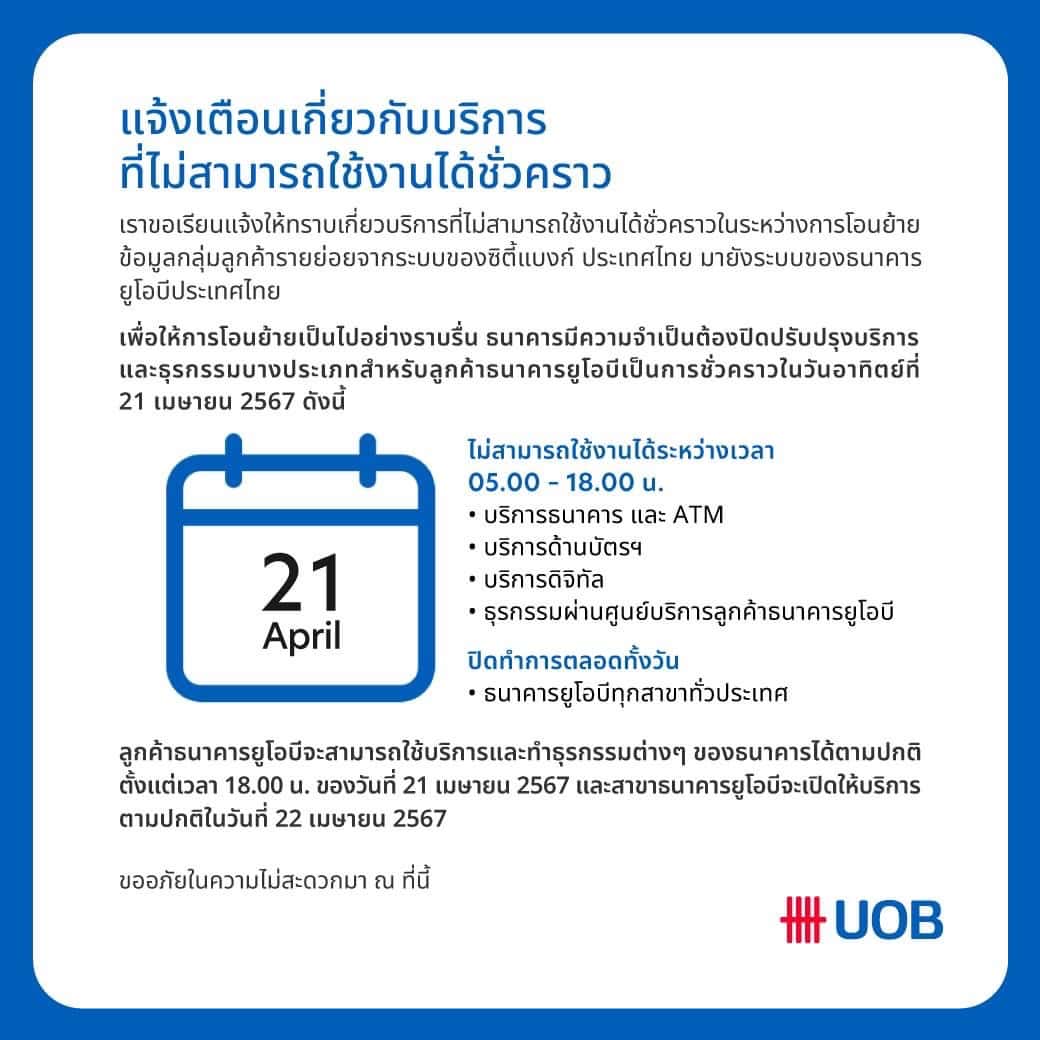 ทั้งนี้ ลูกค้าธนาคารยูโอบีจะสามารถใช้บริการและทำธุรกรรมต่าง ๆ ของธนาคารได้ตามปกติ ตั้งแต่ 18.00 น.ของวันที่ 21 เมษายน 2567 และสาขาธนาคารยูโอบีจะเปิดให้บริการตามปกติในวันที่ 22 เมษายน 2567 หากมีการเปลี่ยนแปลงใด ๆ ธนาคารจะแจ้งให้ท่านทราบผ่านเว็บไซต์และสื่อโซเชียลมีเดียของธนาคารโดยเร็วที่สุด