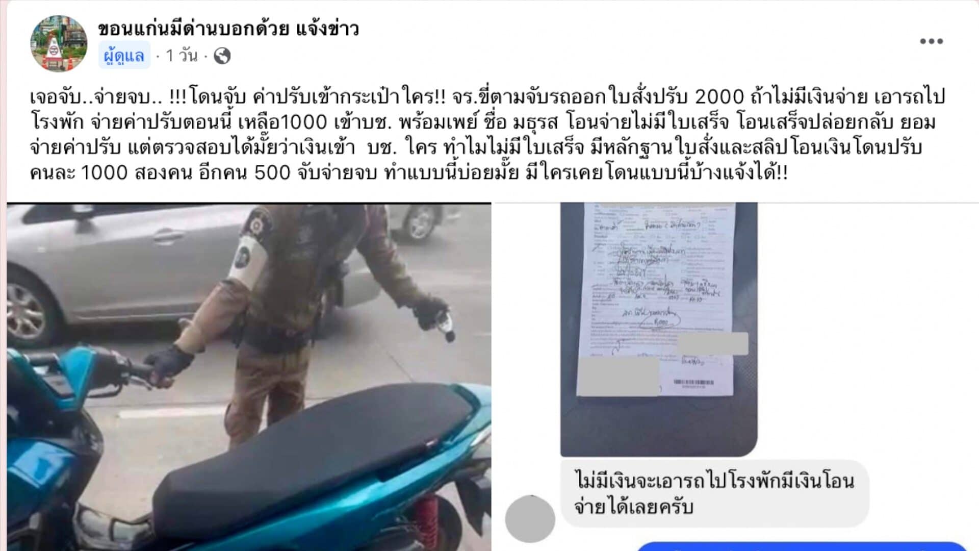 22 เมษายน ผู้สื่อข่าวรายงานว่า ในกลุ่มเฟซบุ๊ก “ขอนแก่นมีด่าน แจ้งข่าวสารประโยชน์” ซึ่งเป็นกลุ่มสาธารณะชื่อดังของเมืองขอนแก่น มีผู้ติดตามกว่า 59,000 คน ได้โพสต์ภาพและเรื่องราวของสมาชิกรายหนึ่งที่ถูกชายซึ่งอ้างเป็นเจ้าหน้าที่ตำรวจงานจราจร สังกัด สภ.เมืองขอนแก่น ออกใบสั่งปรับวินัยจราจร ก่อนจะมีการเสนอลดค่าปรับให้ แต่ต้องโอนเงินเข้าบัญชีธนาคารของหญิงรายหนึ่ง ชื่อ “มธุรส ….” เพื่อแลกกับการไม่ต้องไปจ่ายค่าปรับที่โรงพักและไม่ต้องจ่ายค่าปรับเต็มจำนวน