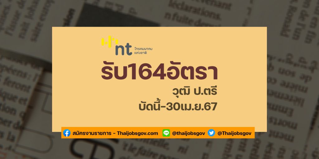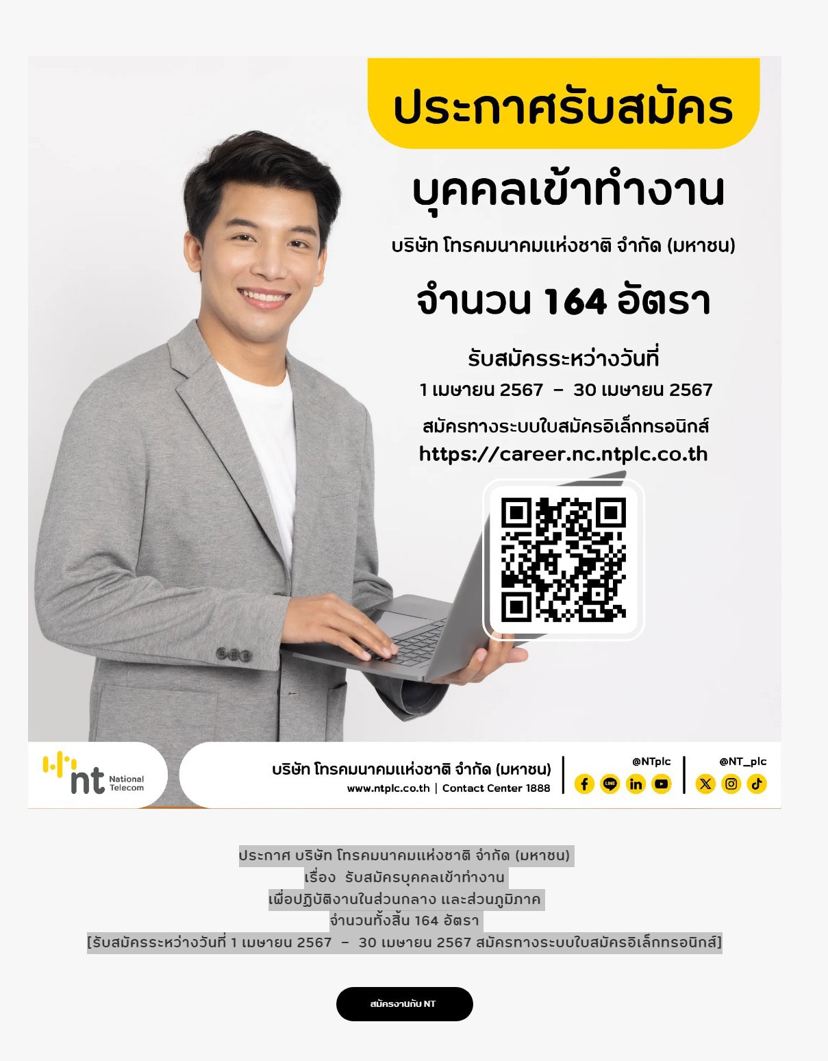 2. บริษัท โทรคมนาคมแห่งชาติ จำกัด (มหาชน) เปิดรับสมัครด้วยระบบใบสมัครอิเล็กทรอนิกส์ ผ่านทาง www.ntplc.co.th ตั้งแต่วันที่ 1 – 30 เมษายน 2567