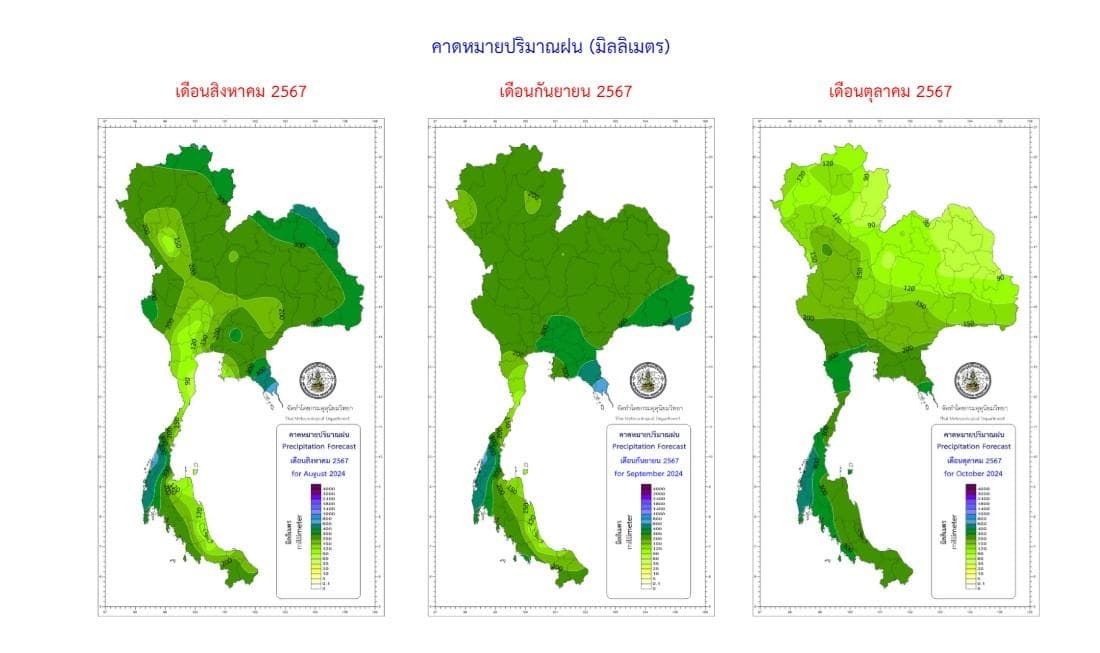 โดยปริมาณฝนรวมของทั้งประเทศในช่วงฤดูฝนปีนี้จะใกล้เคียงค่าเฉลี่ยปกติและใกล้เคียงกับปีที่แล้ว (ปีที่แล้วในช่วงฤดูฝนปริมาณฝนรวมมากกว่าค่าเฉลี่ยปกติร้อยละ 1 ส่วนปริมาณฝนรวมทั้งปีน้อยกว่าค่าเฉลี่ยปกติร้อยละ 6)