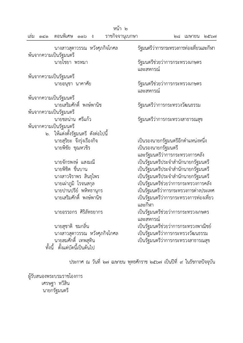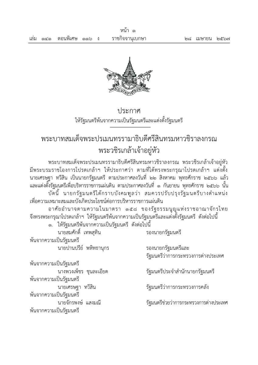 พระบาทสมเด็จพระปรเมนทรรามาธิบดีศรีสินทรมหาวชิราลงกรณ พระวชิรเกล้าเจ้าอยู่หัว มีพระบรมราชโองการโปรดเกล้าฯ ให้ประกาศว่า ตามที่ได้ทรงพระกรุณาโปรดเกล้าฯ แต่งตั้ง นายเศรษฐา ทวีสิน เป็นนายกรัฐมนตรี ตามประกาศลงวันที่ 22 สิงหาคม พุทธศักราช 2566 แล้ว และแต่งตั้งรัฐมนตรีเพื่อบริหารราชการแผ่นดิน ตามประกาศลงวันที่ 1 กันยายน พุทธศักราช 2566 นั้น