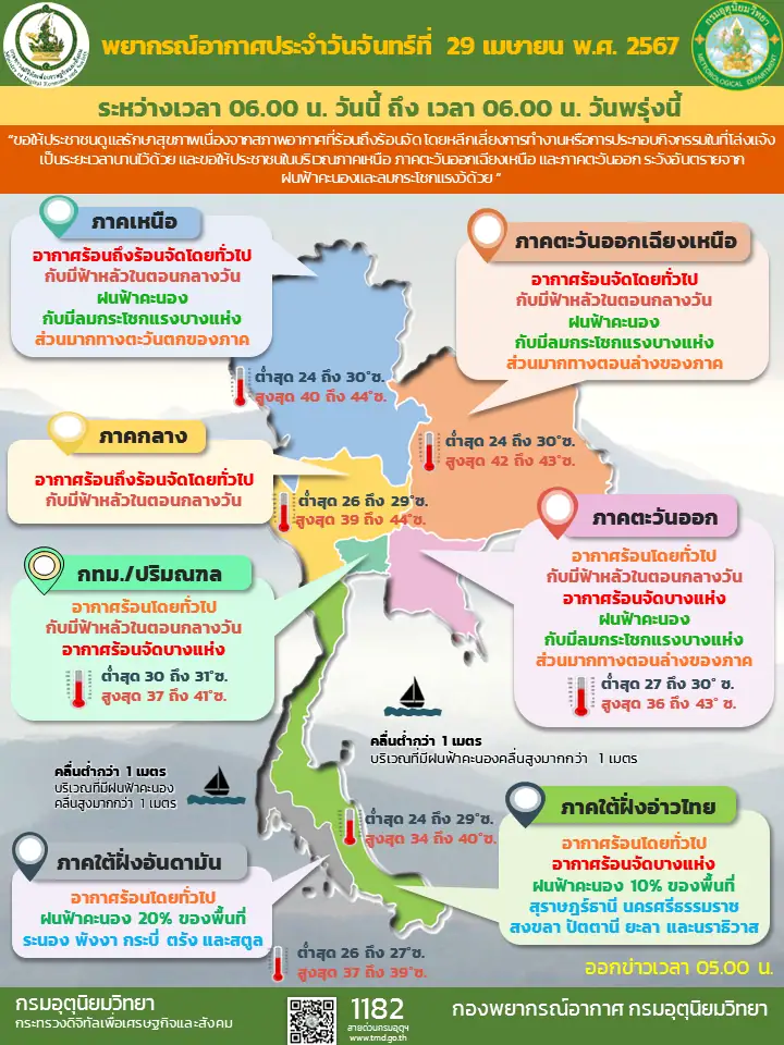 29 เมษายน 2567 กรมอุตุนิยมวิทยา พยากรณ์อากาศ 24 ชั่วโมงข้างหน้า พบว่า ความกดอากาศต่ำเนื่องจากความร้อนปกคลุมประเทศไทยตอนบน ลักษณะเช่นนี้ทำให้ประเทศไทยมีอากาศร้อนถึงร้อนจัดโดยทั่วไปกับมีฟ้าหลัวในตอนกลางวัน ขอให้ประชาชนดูแลรักษาสุขภาพเนื่องจากสภาพอากาศที่ร้อนถึงร้อนจัด โดยหลีกเลี่ยงการทำงานหรือการประกอบกิจกรรมในที่โล่งแจ้งเป็นระยะเวลานานไว้ด้วย ในขณะที่มีลมใต้และลมตะวันตกเฉียงใต้พัดปกคลุมภาคตะวันออกเฉียงเหนือตอนล่างและภาคตะวันออก ทำให้บริเวณดังกล่าวยังคงมีฝนฟ้าคะนองกับมีลมกระโชกแรงบางแห่ง ขอให้ประชาชนระวังอันตรายจากฝนฟ้าคะนองและลมกระโชกแรงไว้ด้วย