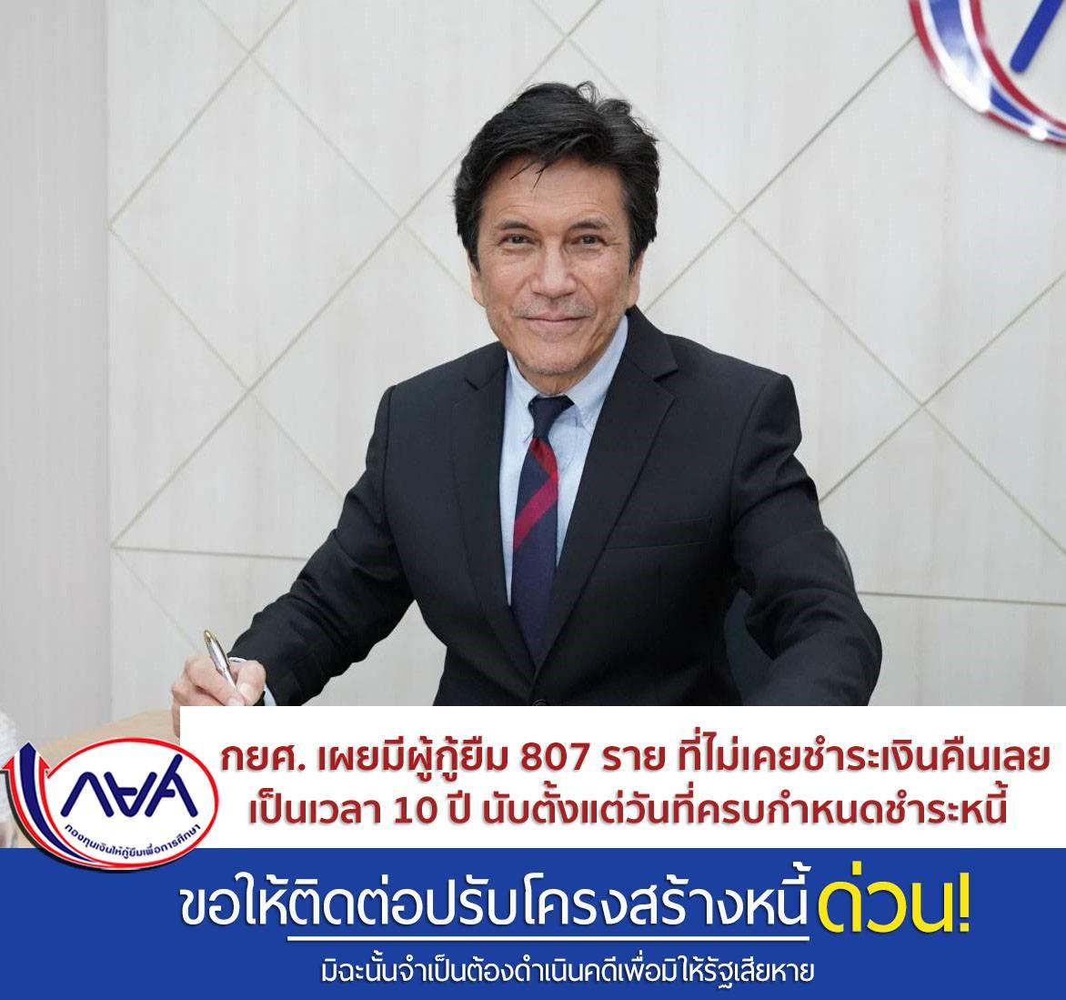 นายชัยณรงค์ กัจฉปานันท์ ผู้จัดการกองทุนเงินให้กู้ยืมเพื่อการศึกษา เปิดเผยว่า ขณะนี้ กองทุนฯอยู่ระหว่างดำเนินการส่งหนังสือขอให้ชำระหนี้และบอกเลิกสัญญาผู้กู้ยืม จำนวน 807 ราย ที่ไม่เคยติดต่อชำระเงินคืนเลยเป็นเวลา 10 ปี นับตั้งแต่วันที่ครบกำหนดชำระหนี้ หากผู้กู้ยืมยังเพิกเฉยกองทุนฯมีความจำเป็นต้องดำเนินคดีเพื่อมิให้รัฐเสียหาย แต่หากผู้กู้ยืมกลุ่มดังกล่าวมาปรับโครงสร้างหนี้ จะมีโอกาสขยายระยะเวลาผ่อนชำระอีก 15 ปี และผู้ค้ำประกันจะหลุดพ้นจากความรับผิดทันทีหลังจากทำสัญญาปรับโครงสร้างหนี้