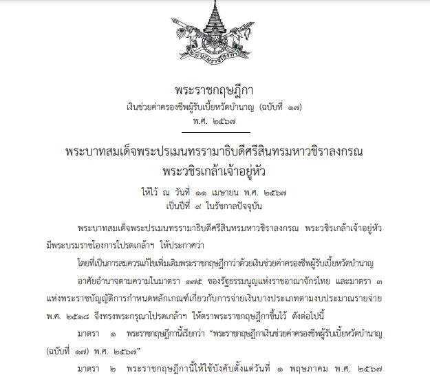 โดยเว็บไซต์ราชกิจจานุเบกษาได้เผยแพร่ พระราชกฤษฎีกาเงินช่วยค่าครองชีพผู้รับเบี้ยหวัดบำนาญ (ฉบับที่ 17) พ.ศ. 2567 มีผลบังคับใช้วันที่ 1 พฤษภาคม 2567 เป็นต้นไป