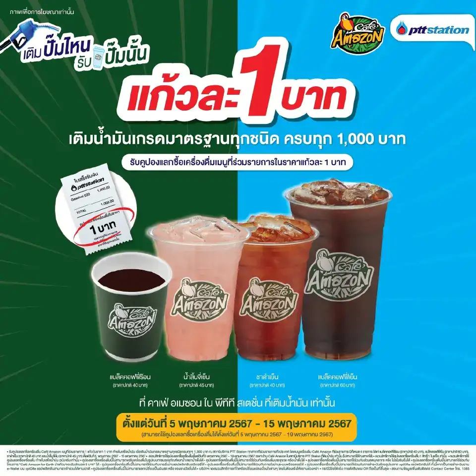 1. รับคูปองแลกซื้อเครื่องดื่ม Café Amazon เมนูที่ร่วมรายการ 1 แก้ว* ในราคา 1 บาท ท้ายใบเสร็จน้ำมัน เมื่อเติมน้ำมันเกรดมาตรฐานทุกชนิดครบทุกๆ 1,000 บาท ณ สถานีบริการ PTT Station ทุกสาขาที่ร่วมรายการทั่วประเทศ