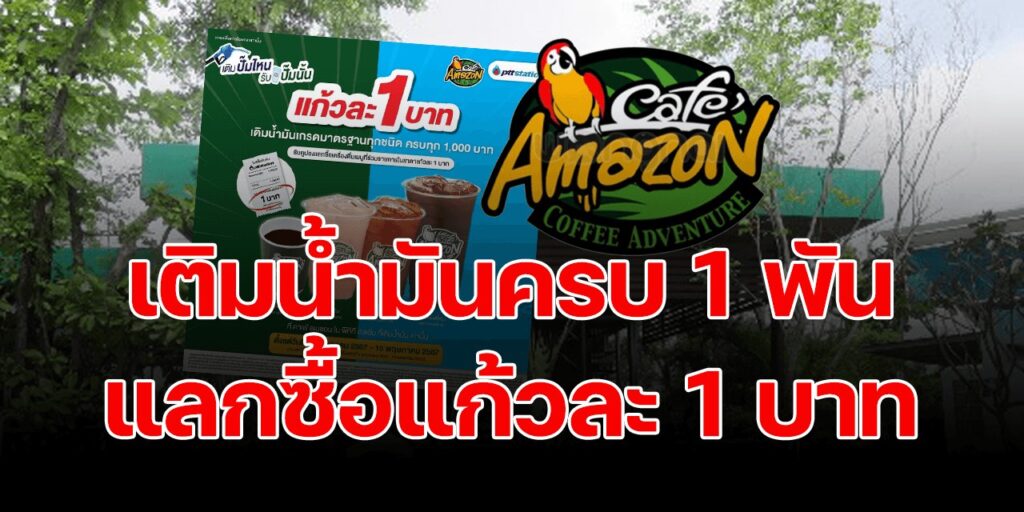 PTT Station ออกโปรโมชั่นร่วมกับ คาเฟ่ อเมซอน ทั่วประเทศ ล่าสุด เพจ Café Amazon โพสต์ข้อความว่า เติมปั๊มไหน รับปั๊มนั้น คาเฟ่ อเมซอน แก้วละ 1 บาท เมื่อเติมน้ำมันที่ PTT Station ครบทุก 1,000 บาท